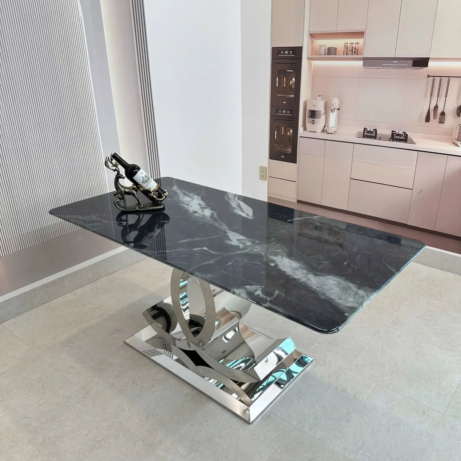 ✔ Chân bàn chữ C đối: Thiết kế đối xứng hiện đại, mạ inox gương bóng bẩy, tạo điểm nhấn độc đáo cho phòng ăn.