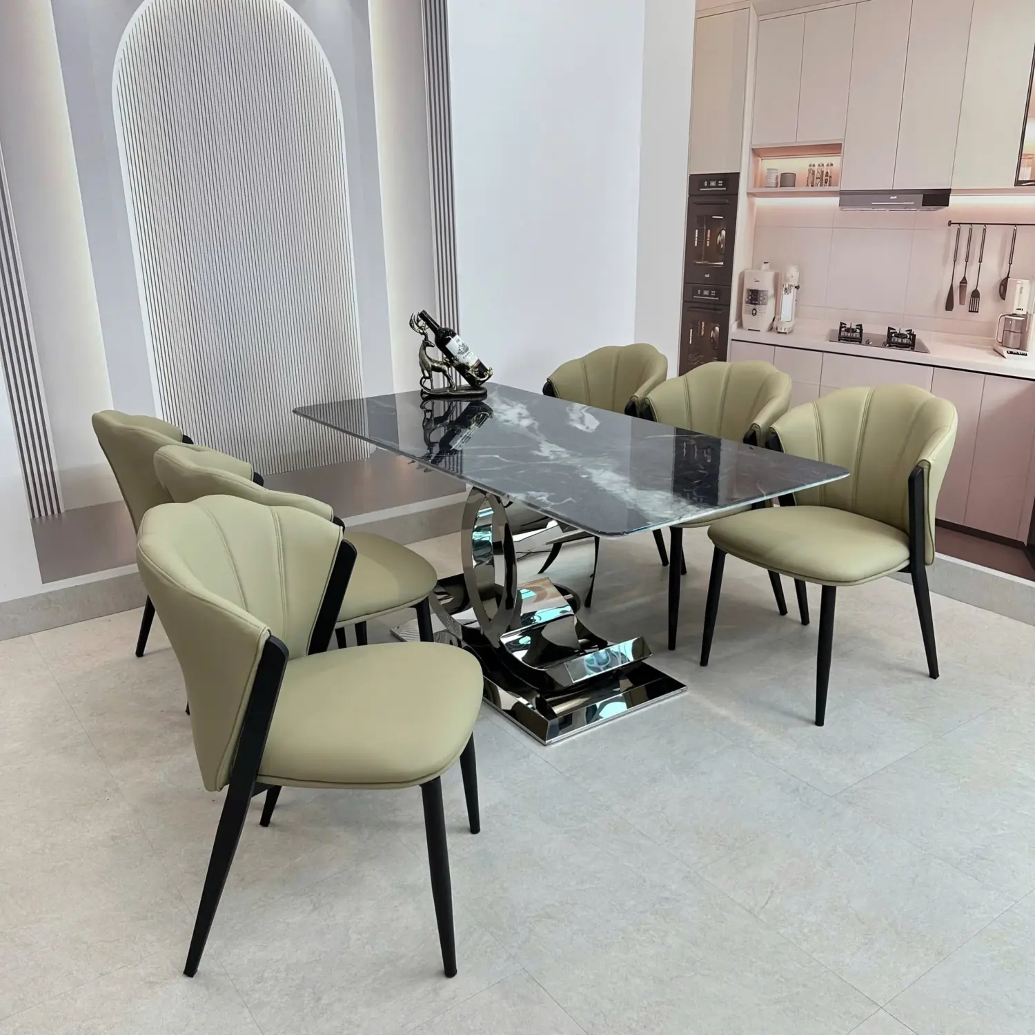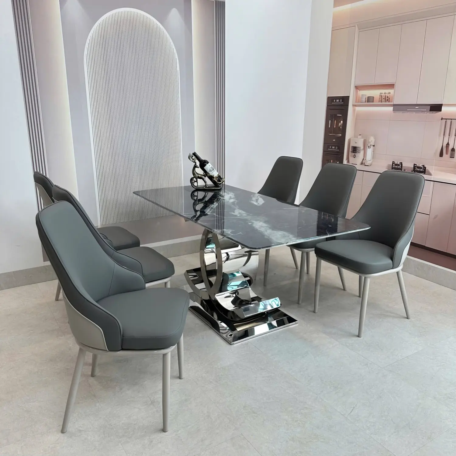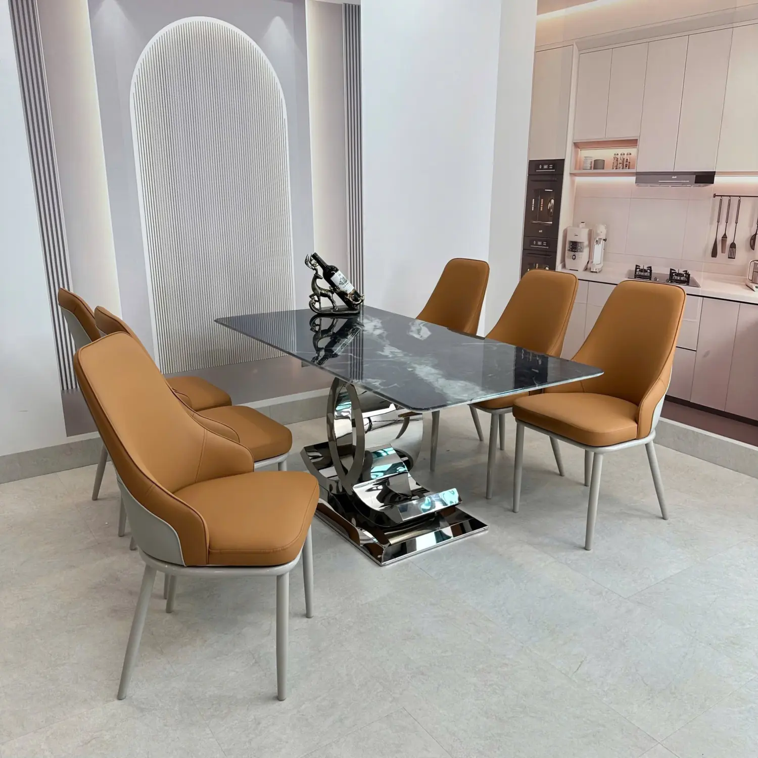 Bàn Ăn Mặt Đá 6 Ghế Chân Chữ C Đối Hiện Đại – Sang Trọng & Ấn Tượng