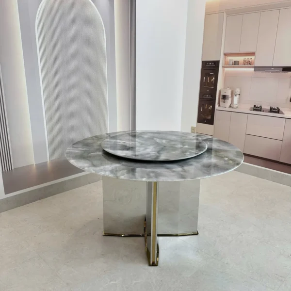 Mẫu bàn ăn mặt đá SP12052 được yêu thích nhờ thiết kế chân chữ C đối độc đáo, mang hơi hướng nghệ thuật đương đại. Mặt bàn đá vân mây tự nhiên kết hợp với chân inox gương sáng bóng giúp tổng thể vừa sang trọng vừa hiện đại – là điểm nhấn hoàn hảo cho không gian phòng bếp cao cấp.