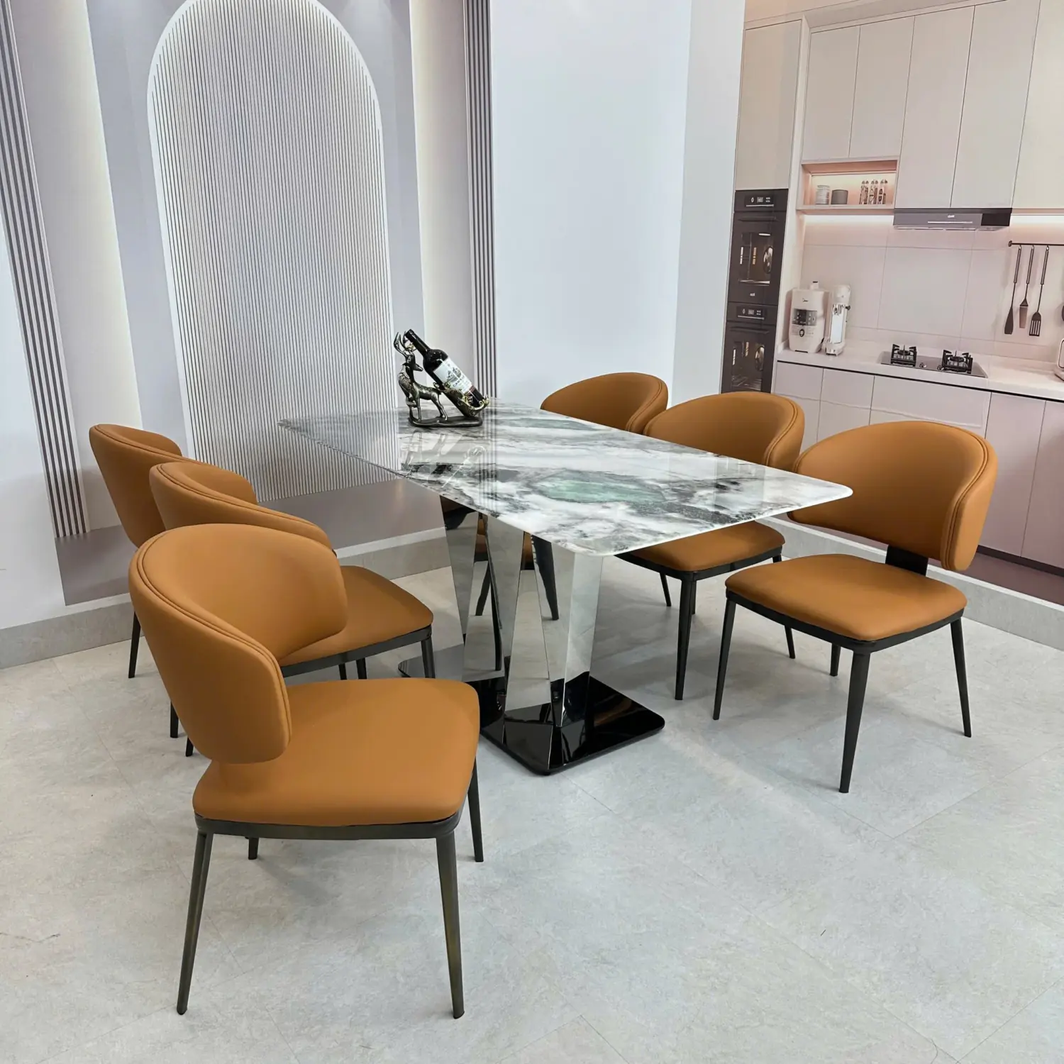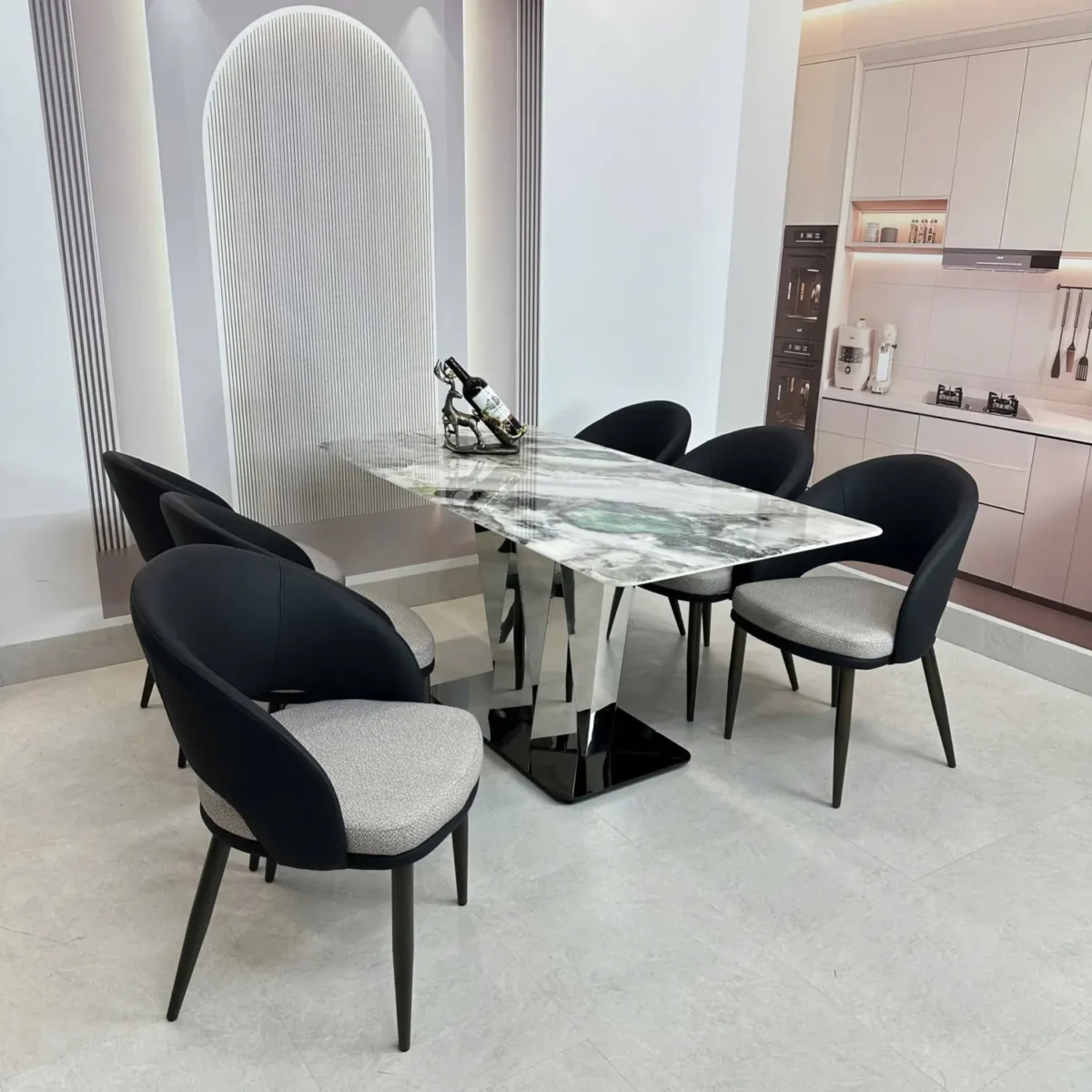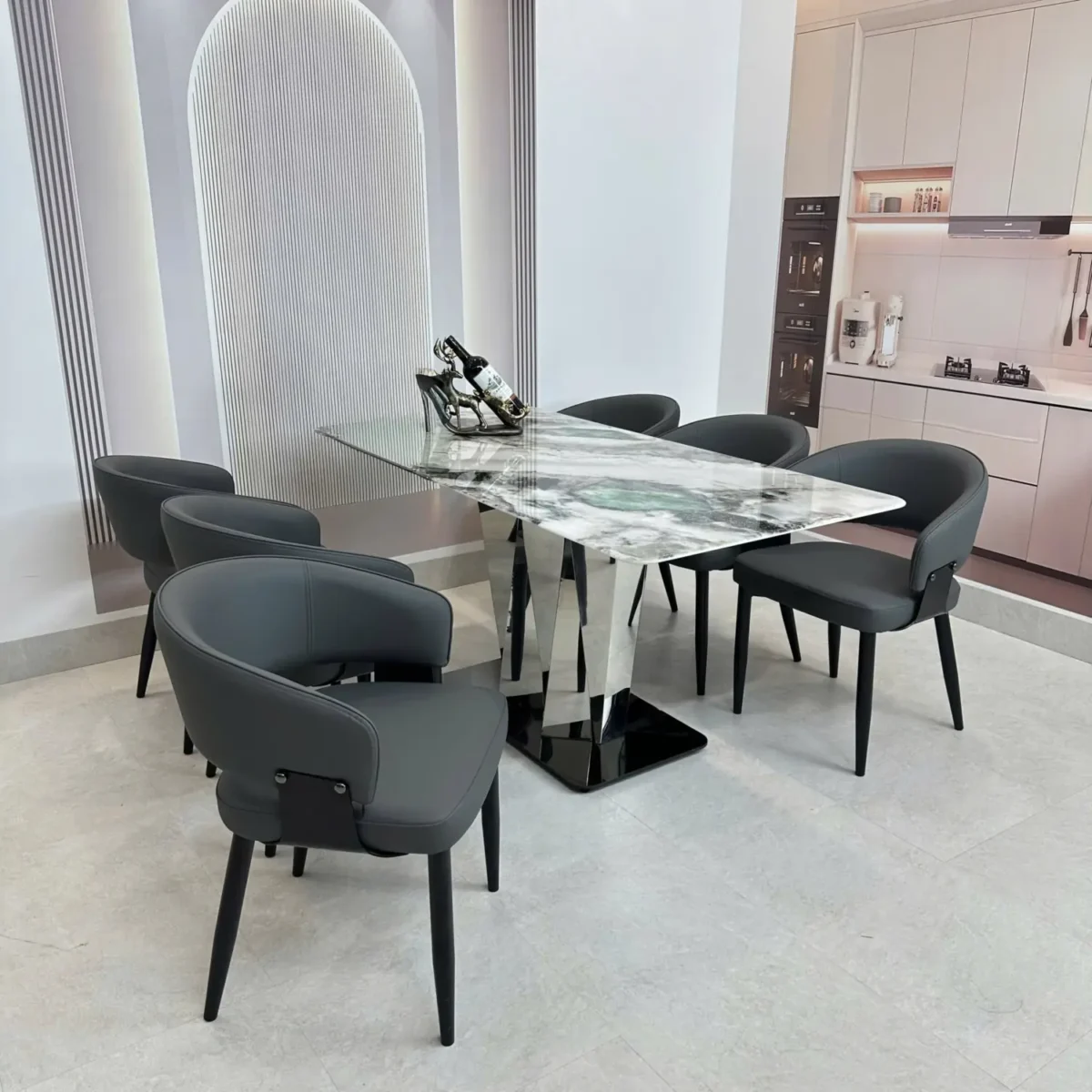 Bàn Ăn Mặt Đá 6 Ghế – Chân Inox Tam Giác Hiện Đại & Sang Trọng