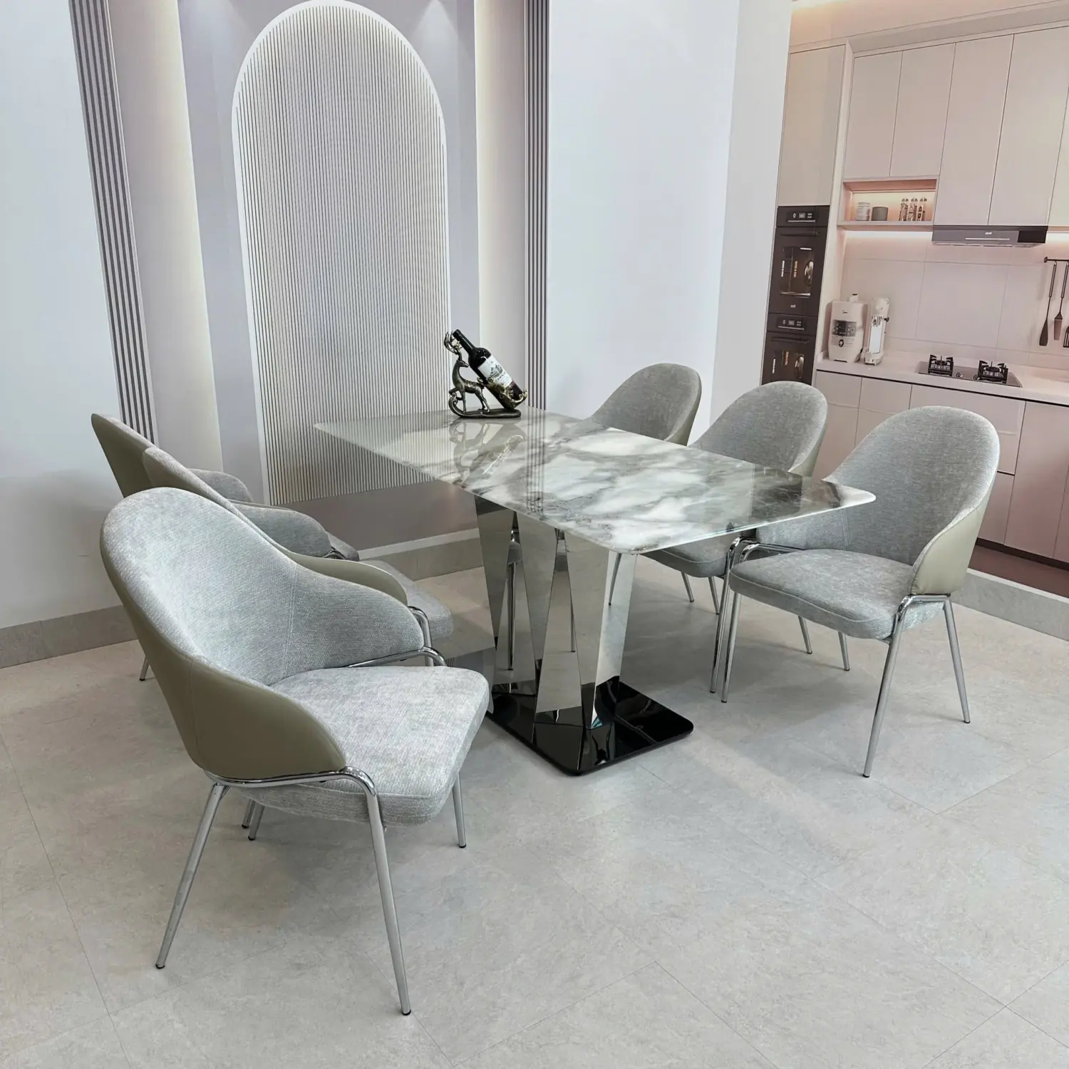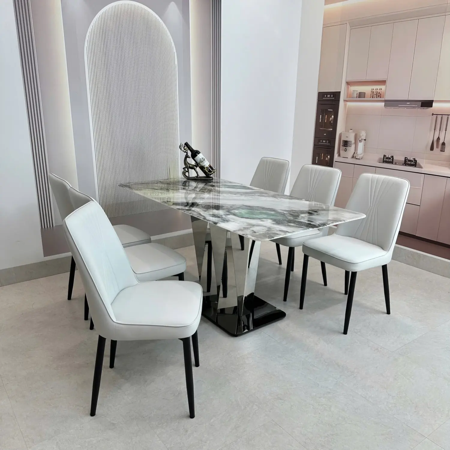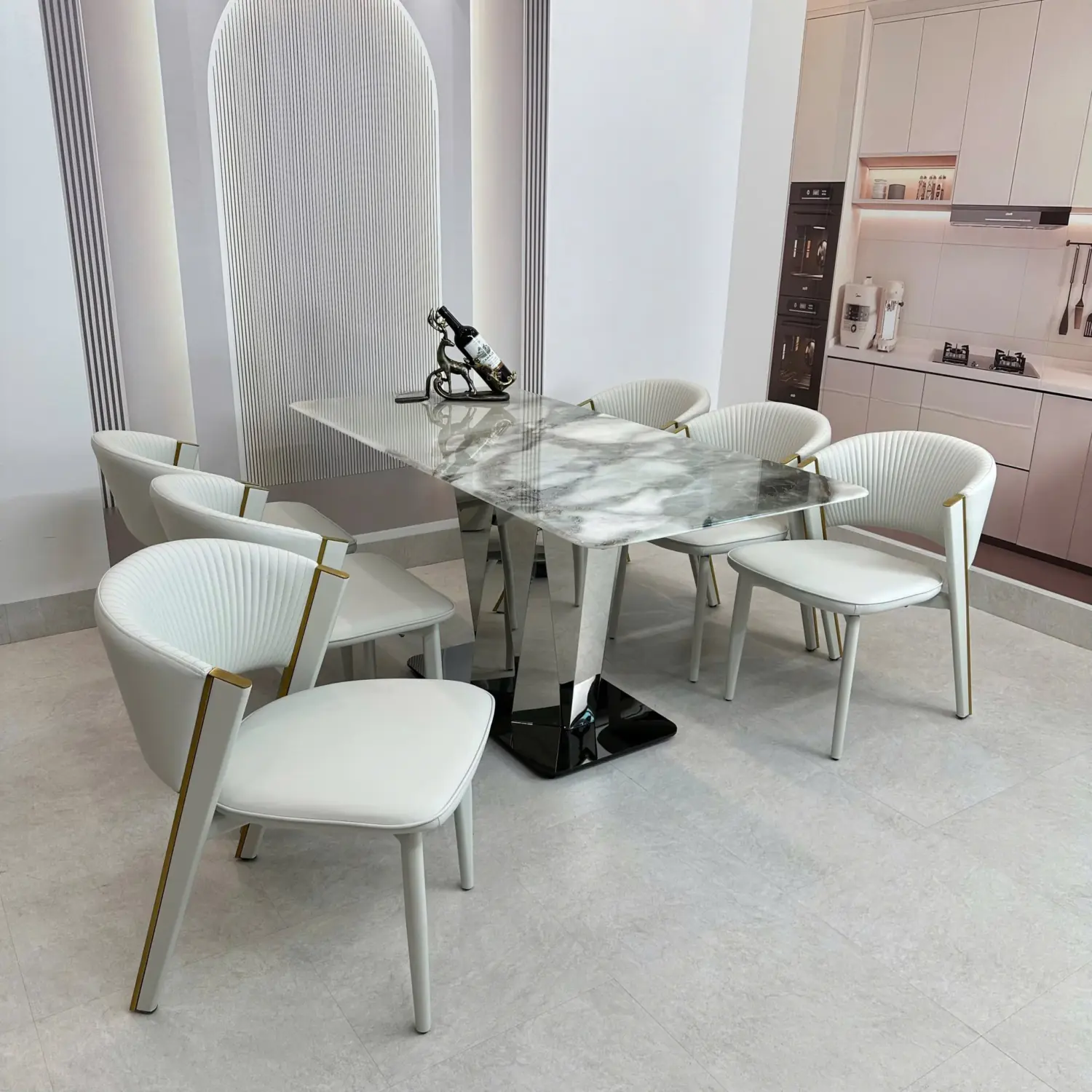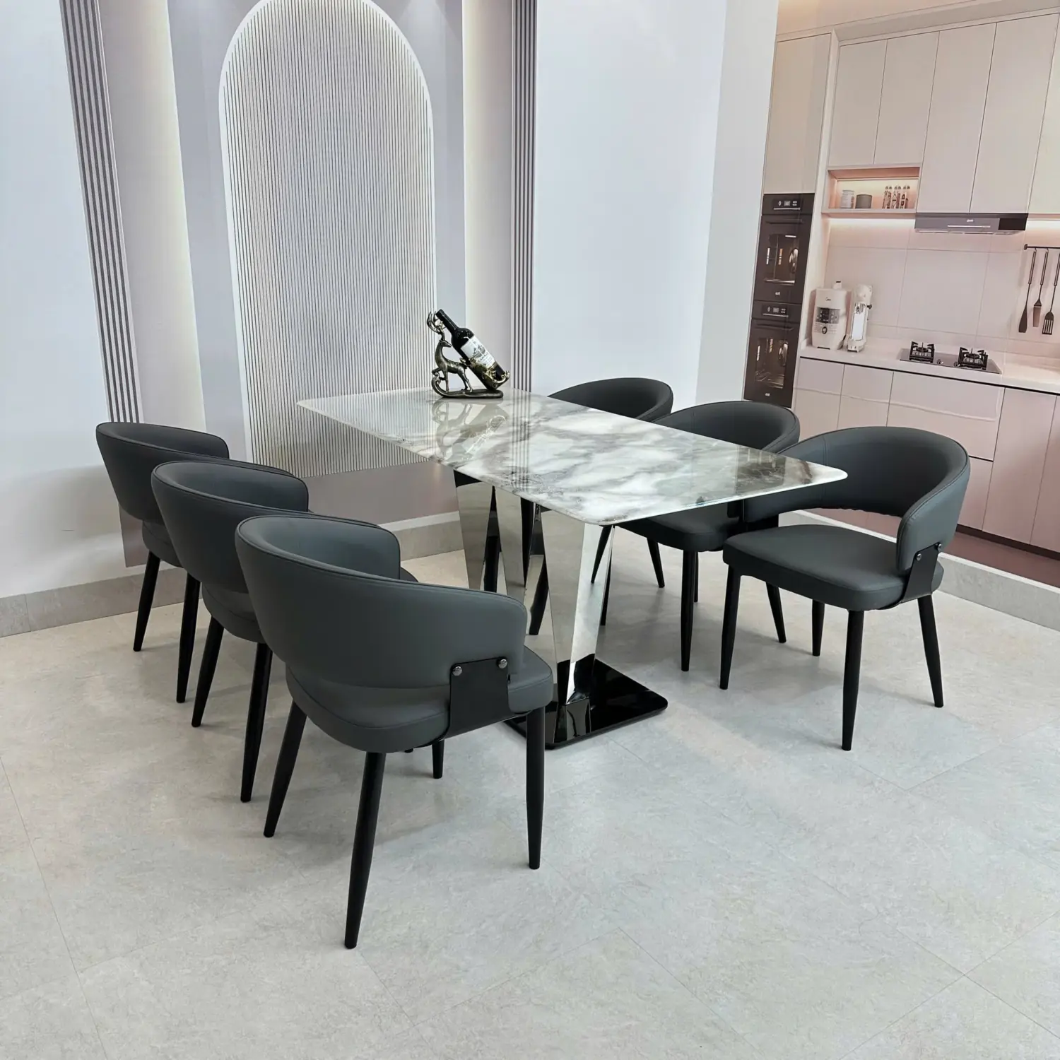 Bàn Ăn Mặt Đá 6 Ghế – Chân Inox Tam Giác Hiện Đại & Sang Trọng