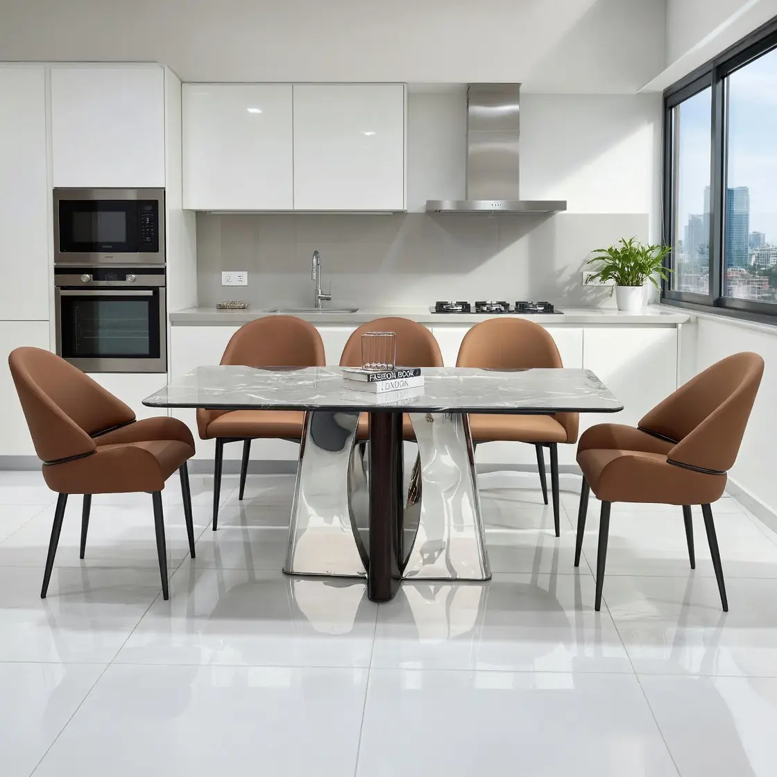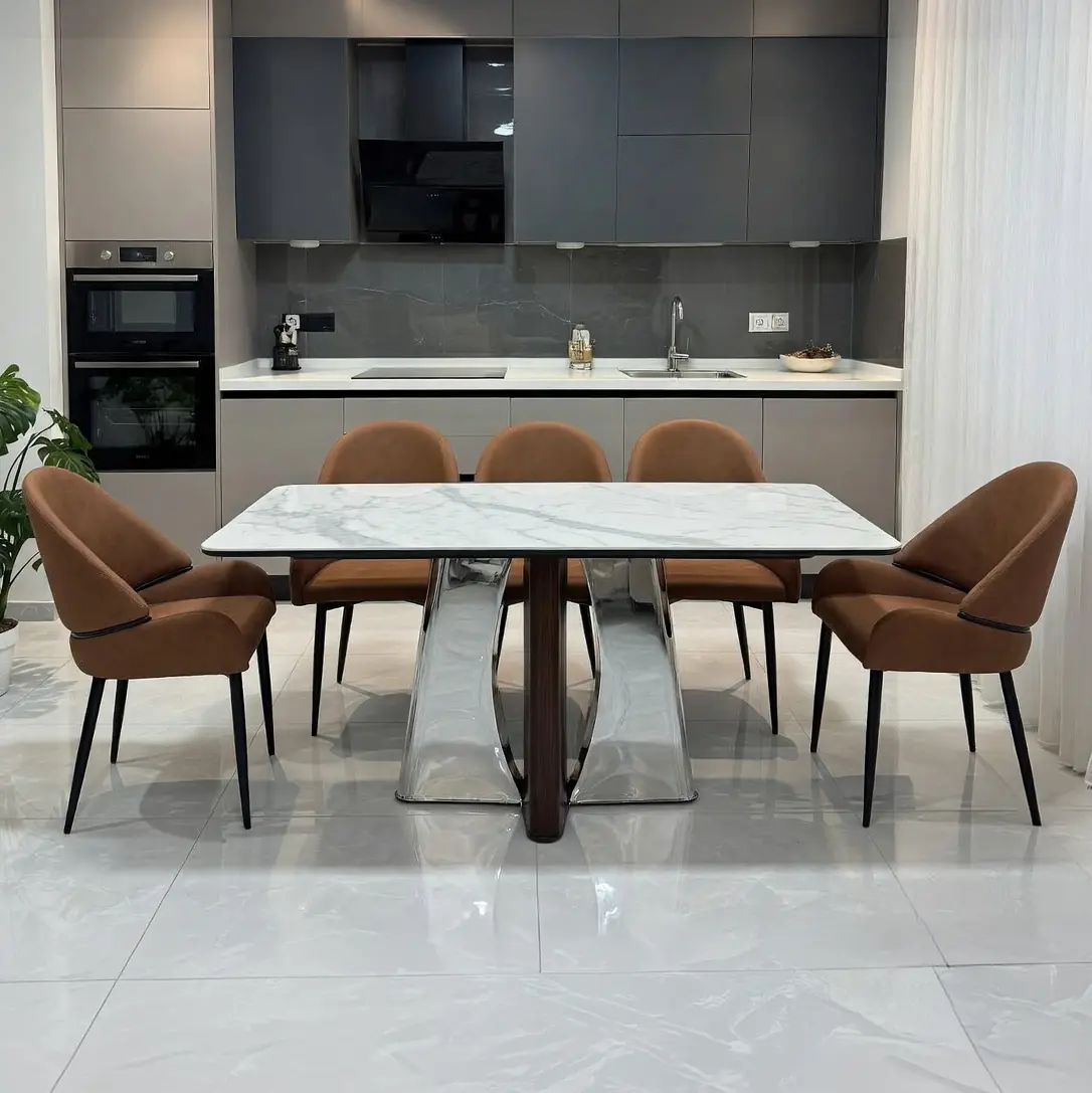 Bàn ăn mặt đá vi tinh thể chân inox kết hợp ghế da nhập khẩu mang đến vẻ đẹp sang trọng, bóng bẩy và giải pháp tối ưu diện tích cực kỳ hiệu quả cho phòng bếp. Sản phẩm hiện đang được phân phối chính hãng tại tổng kho nội thất Tongkhonoithatgiadinh.com, là mảnh ghép nội thất gia đình hoàn hảo cho những gia chủ yêu thích lối sống tiện nghi và tinh tế.