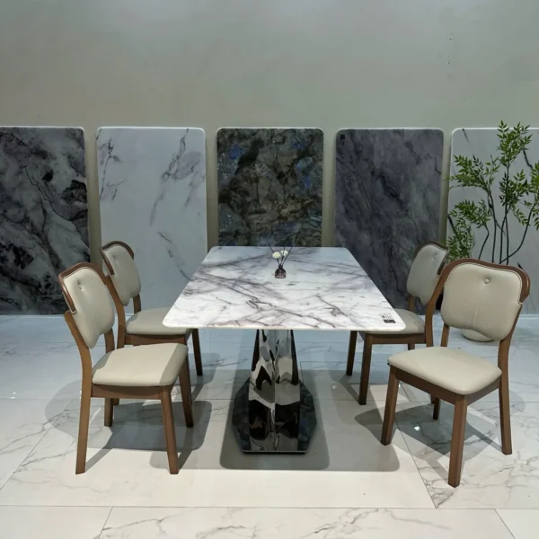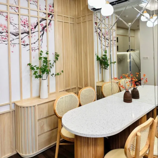 Bề mặt đá nhám nhẹ, chống trầy, chịu nhiệt tốt, dễ lau chùi – cho cảm giác sạch sẽ, mát tay và sang trọng. Thuộc dòng bàn ăn mặt đá rất được ưa chuộng trong các căn hộ hiện đại.