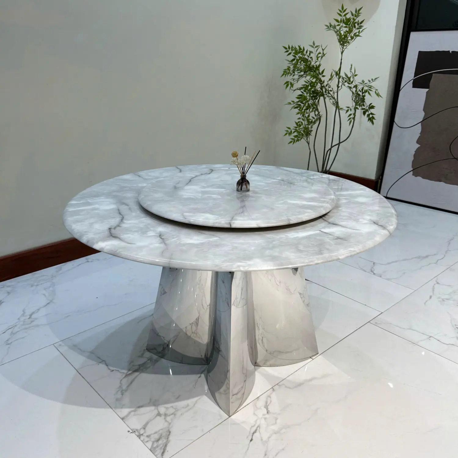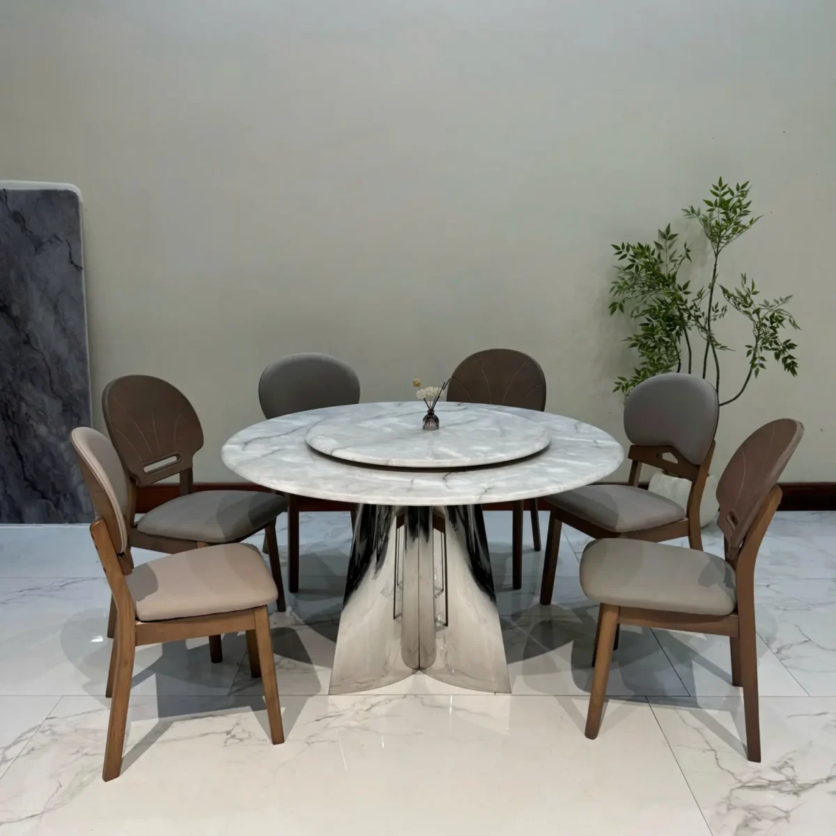 Bề mặt đá vi tinh thể trắng vân mây mang lại cảm giác tinh khôi, sang trọng và hiện đại. Mâm xoay 360° tiện dụng, giúp cả gia đình dễ dàng thưởng thức bữa ăn trọn vẹn. Khung chân bàn được làm từ thép mạ titan ánh gương tạo hiệu ứng phản chiếu bắt mắt, nâng tầm thẩm mỹ cho không gian sống.