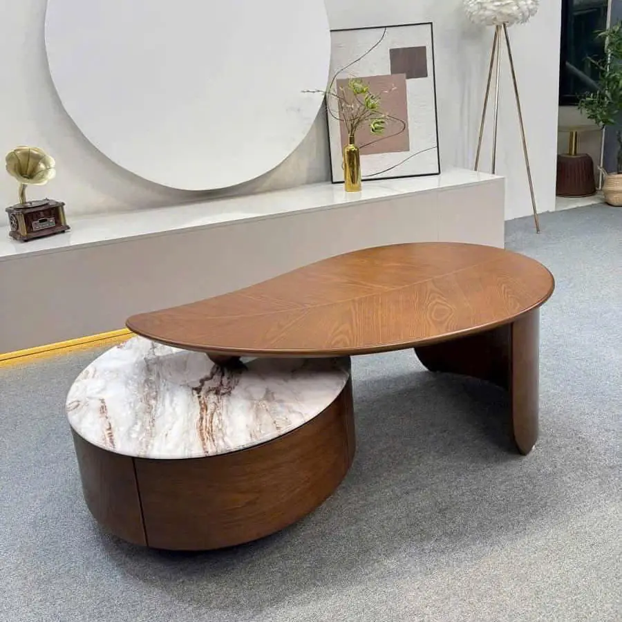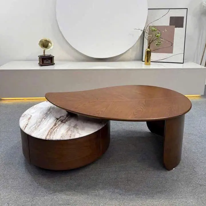 - Kiểu dáng: Bàn trà đôi hình giọt nước, thiết kế tầng bậc lệch hiện đại, có thể tách – gộp linh hoạt tùy không gian.