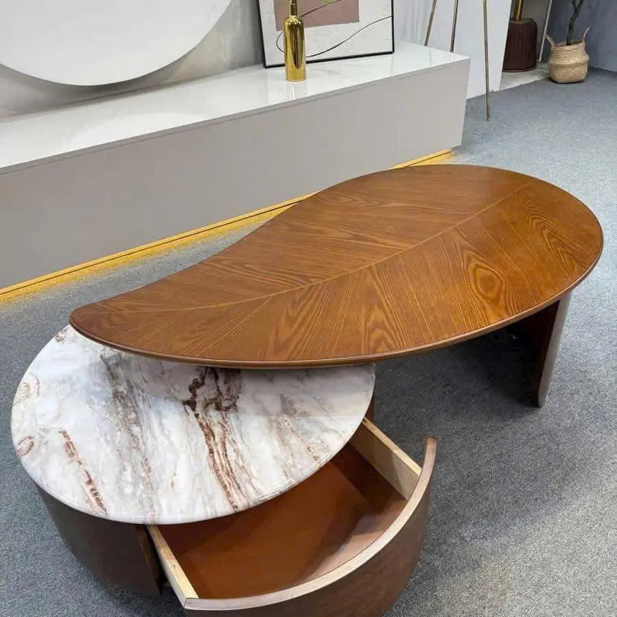 Mẫu bàn trà SP11405 là sự kết hợp hoàn hảo giữa gỗ óc chó tự nhiên và mặt đá vân mây cao cấp, tạo nên tổng thể tinh tế, sang trọng và khác biệt. Thiết kế hai tầng hình giọt nước với độ cao lệch độc đáo không chỉ mang tính thẩm mỹ cao mà còn tối ưu công năng sử dụng trong không gian phòng khách hiện đại.