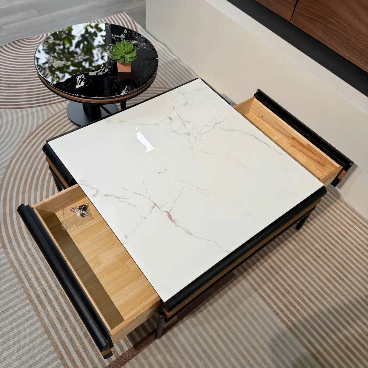 Sự phối màu giữa mặt đá sáng và các chi tiết tối màu mang lại tổng thể hài hòa, sang trọng nhưng không quá cầu kỳ. Thiết kế này giúp bàn trà dễ dàng kết hợp với nhiều kiểu sofa và phong cách nội thất khác nhau.