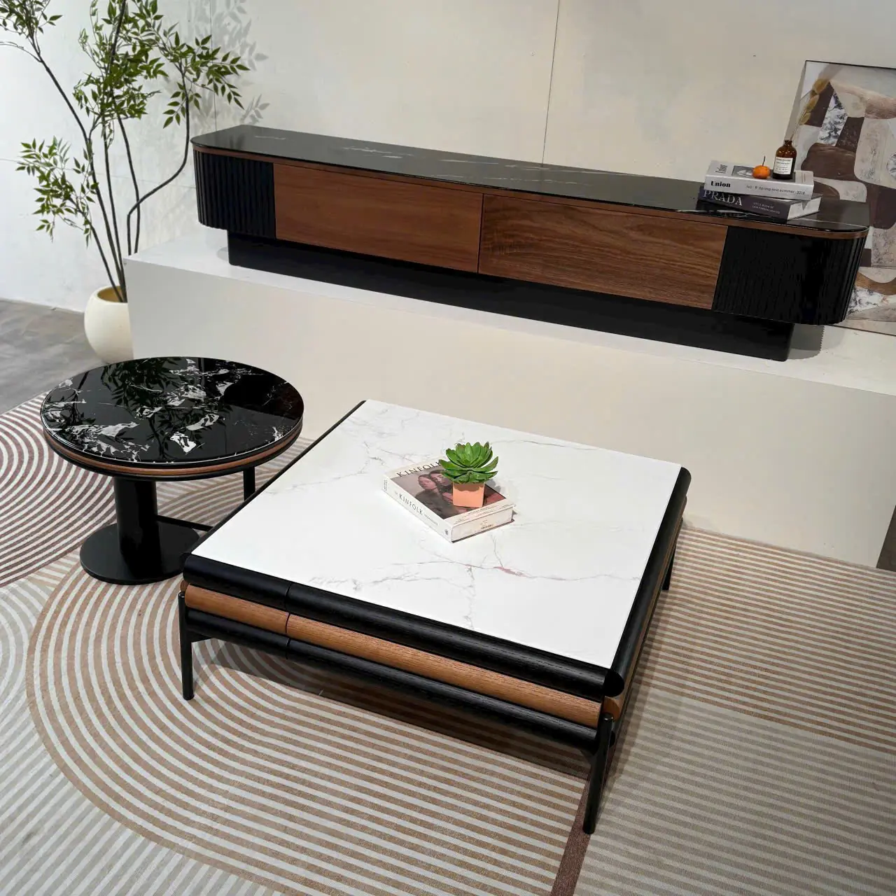 Bàn trà đôi mặt đá phối màu thanh lịch là lựa chọn lý tưởng cho những không gian phòng khách hiện đại, nơi đề cao sự gọn gàng, tinh tế nhưng vẫn thể hiện rõ gu thẩm mỹ của gia chủ. Thiết kế bàn trà đôi linh hoạt giúp không gian trở nên hài hòa hơn, đồng thời mang lại sự tiện lợi trong quá trình sử dụng hằng ngày.