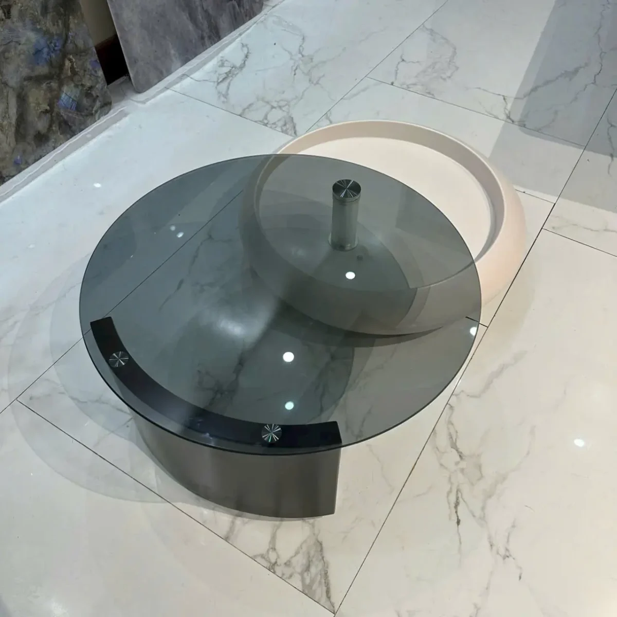 Mẫu bàn trà đôi mặt kính kết hợp đá cao cấp mang phong cách hiện đại, là điểm nhấn nổi bật cho không gian phòng khách sang trọng. Thiết kế gồm hai bàn tròn với chiều cao và chất liệu khác nhau, tạo nên bố cục linh hoạt, vừa đẹp mắt vừa tối ưu công năng sử dụng trong sinh hoạt hằng ngày.