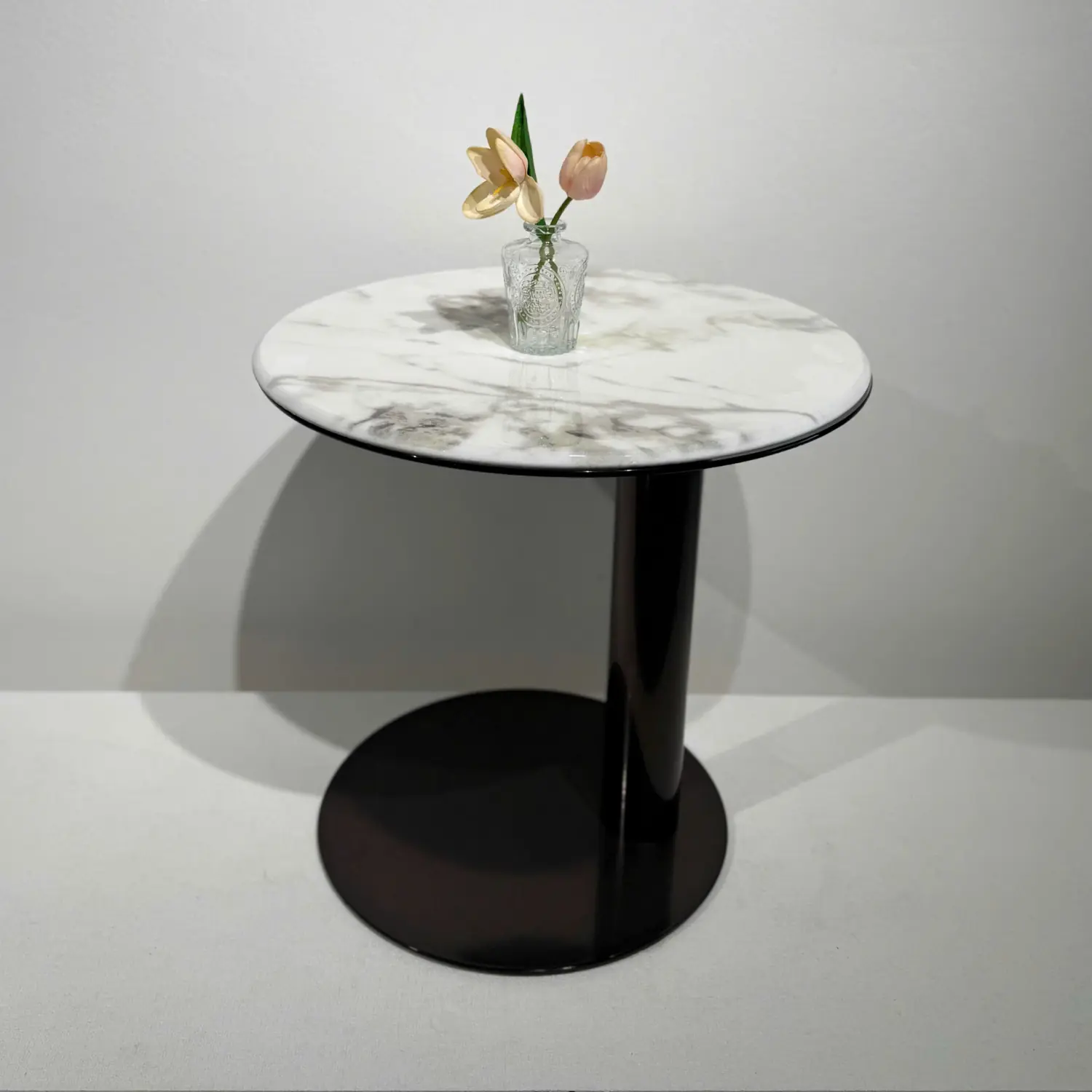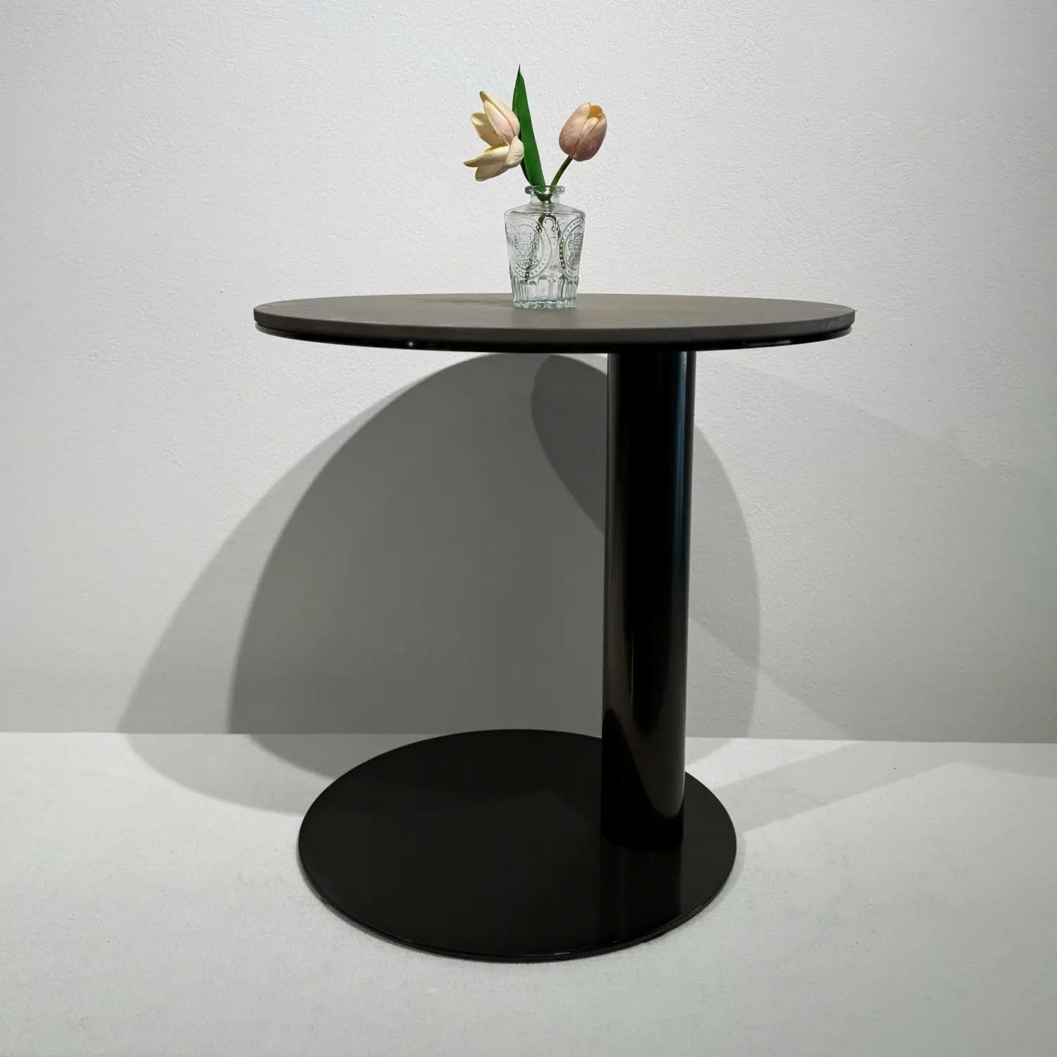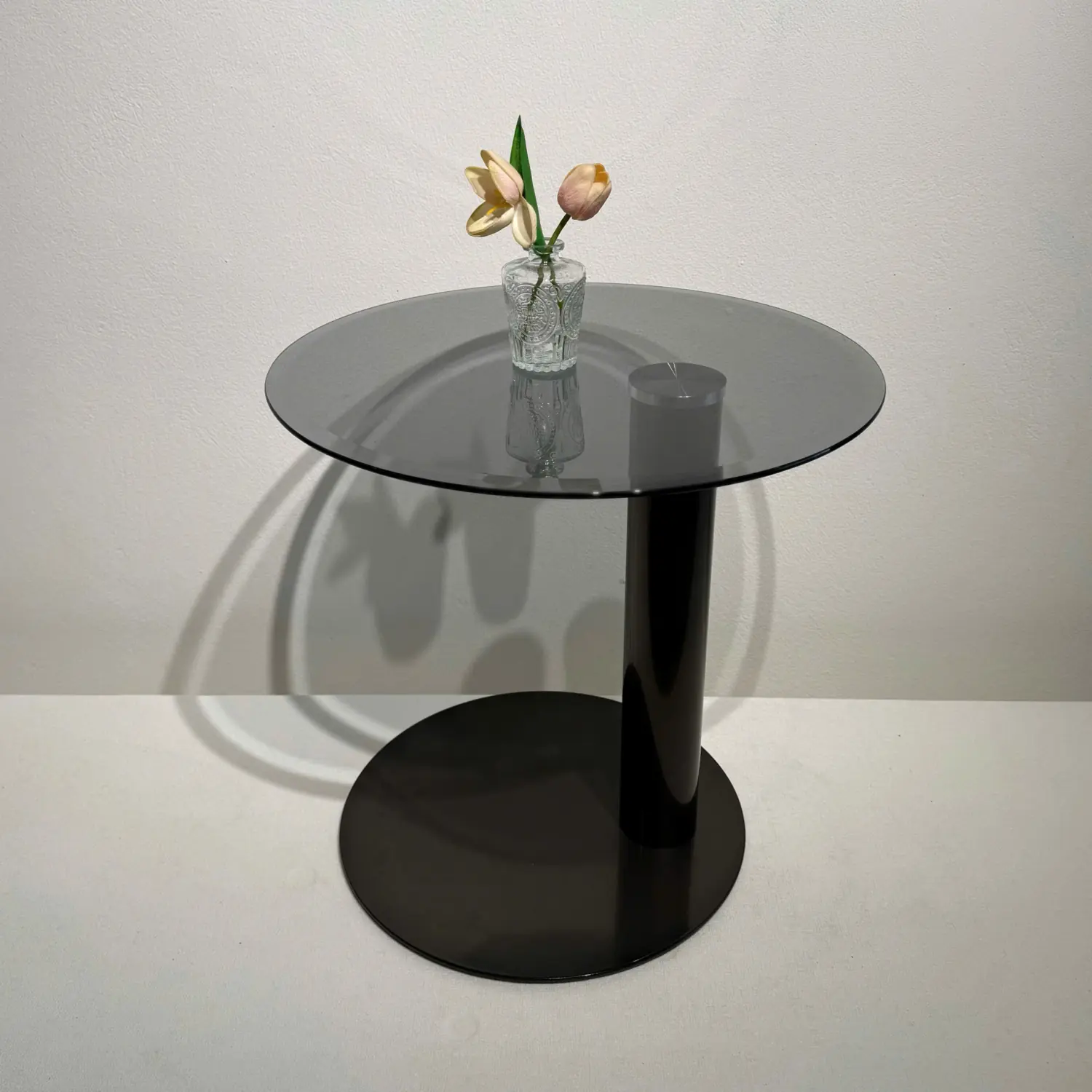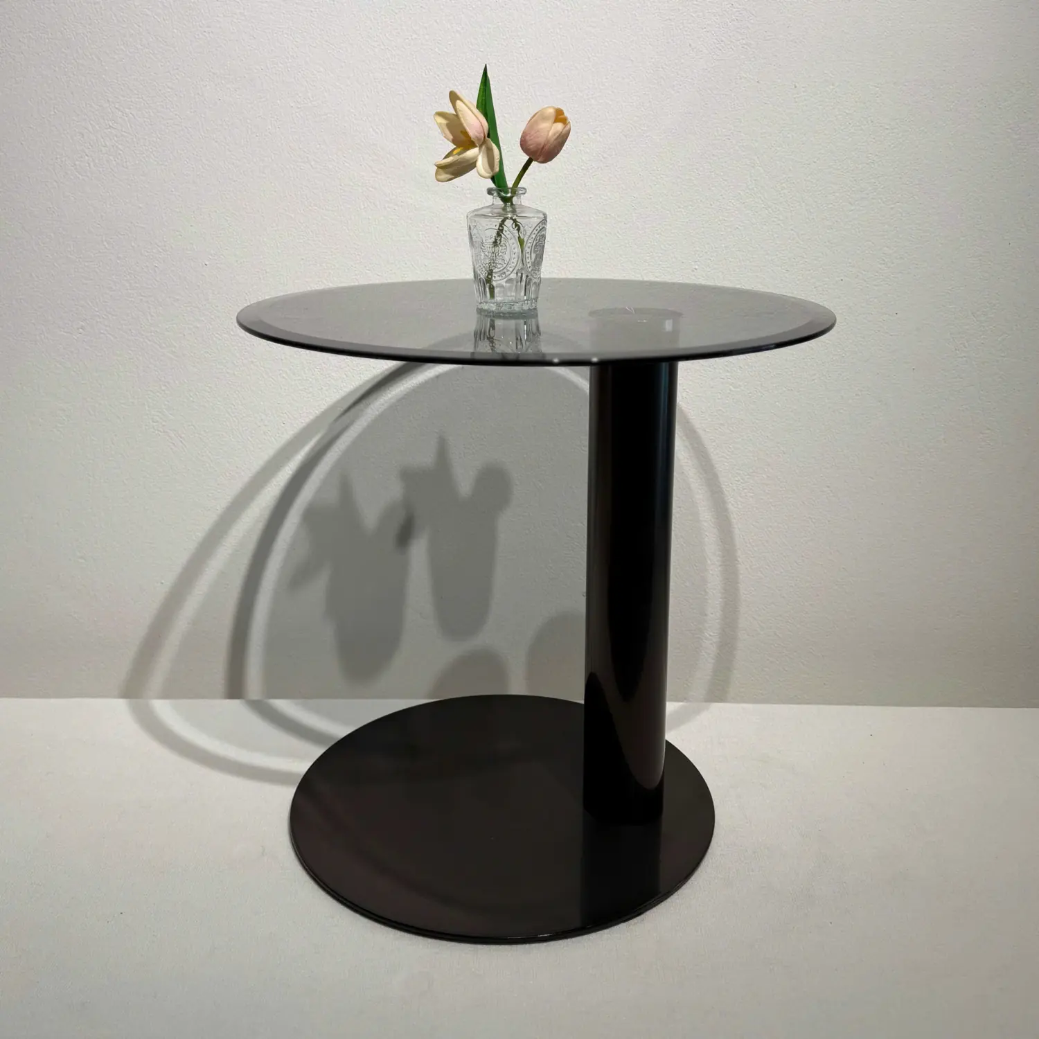 Kích thước gọn gàng với đường kính mặt bàn 50 cm × cao 48 cm, giúp bàn dễ dàng đặt ở góc sofa, bên cạnh ghế thư giãn hoặc làm bàn phụ. Mặt kính cường lực đen bóng cao cấp chống trầy xước, dễ vệ sinh và tạo hiệu ứng phản chiếu ánh sáng đẹp mắt. Chân trụ tròn sơn đen chắc chắn, mang lại sự ổn định và phong cách hiện đại mạnh mẽ.