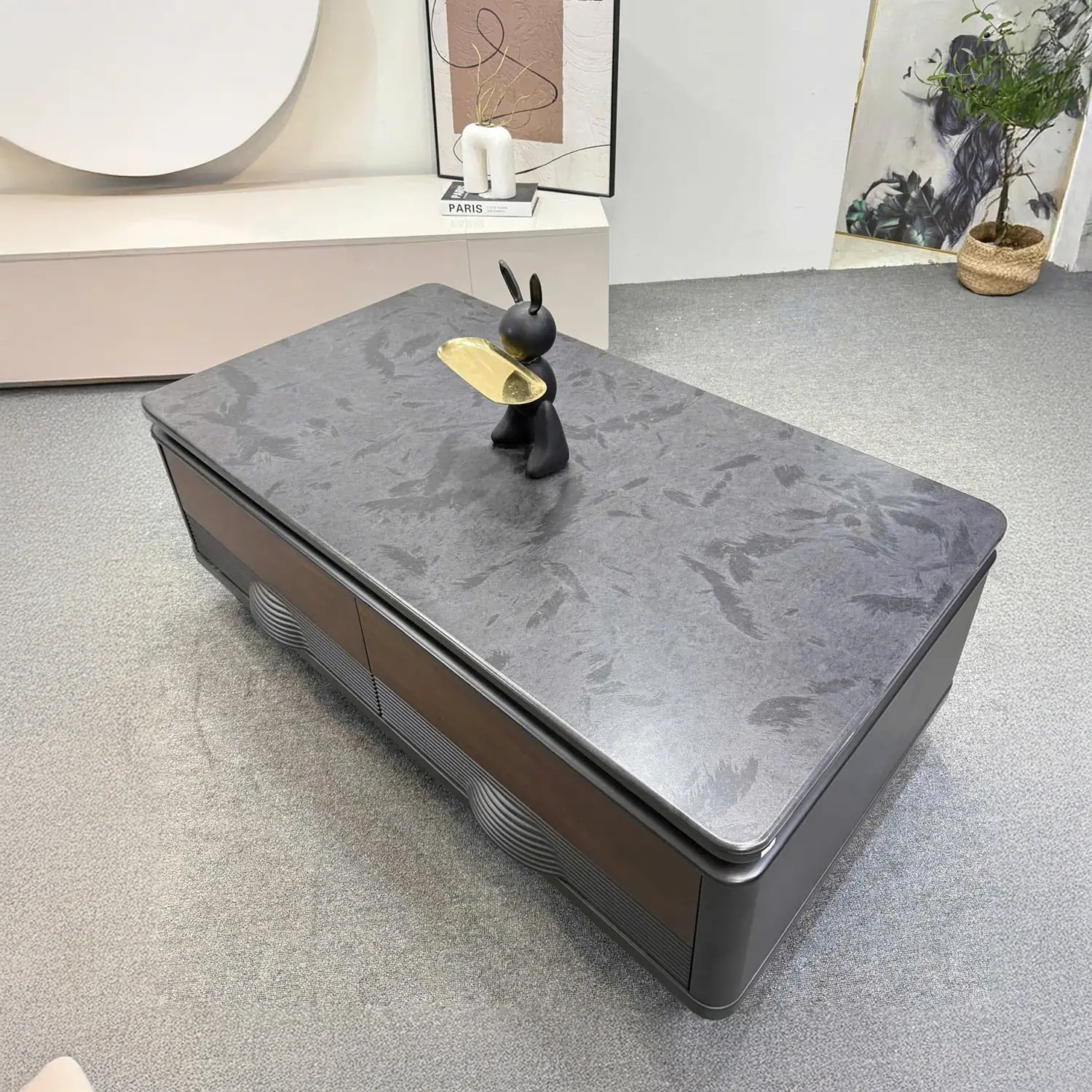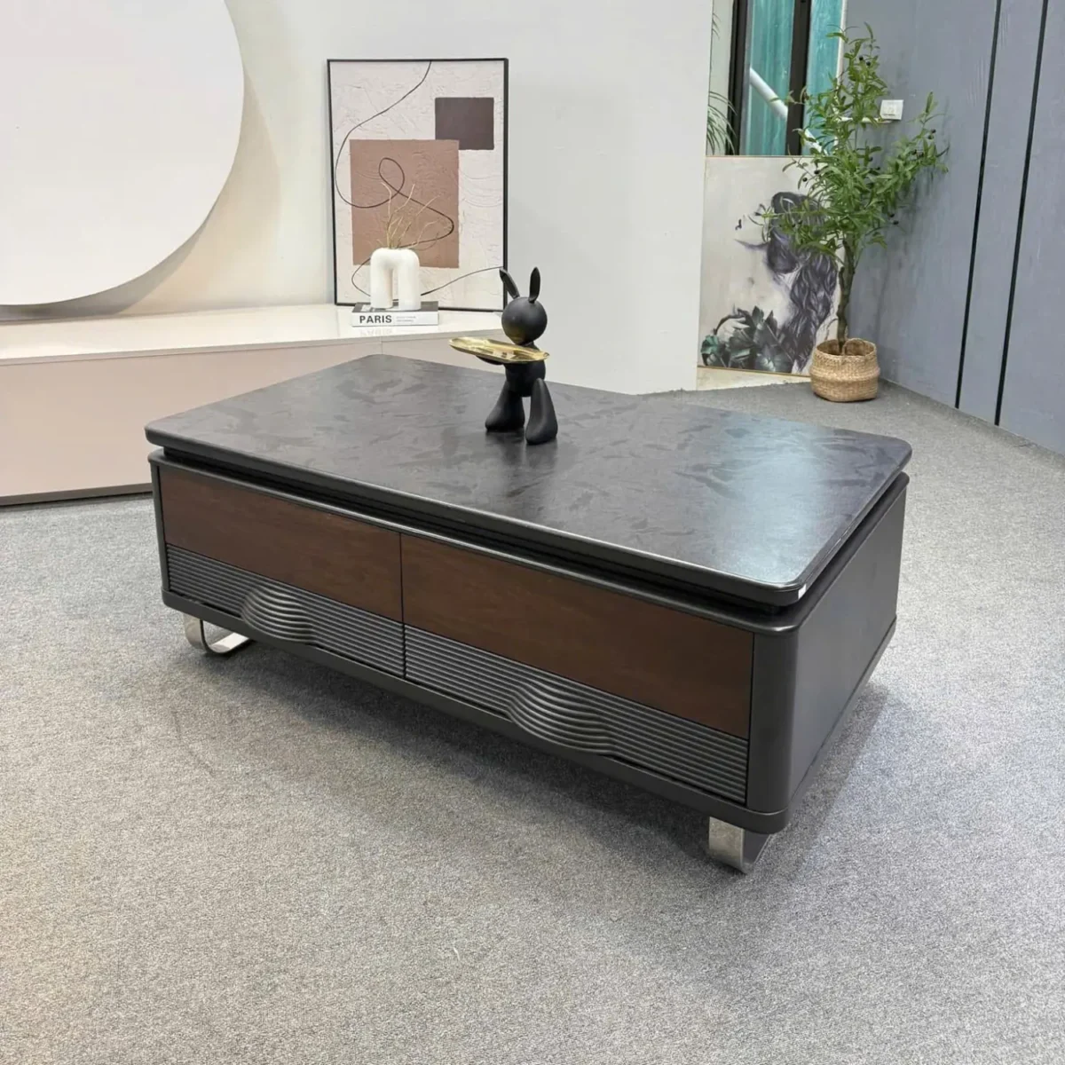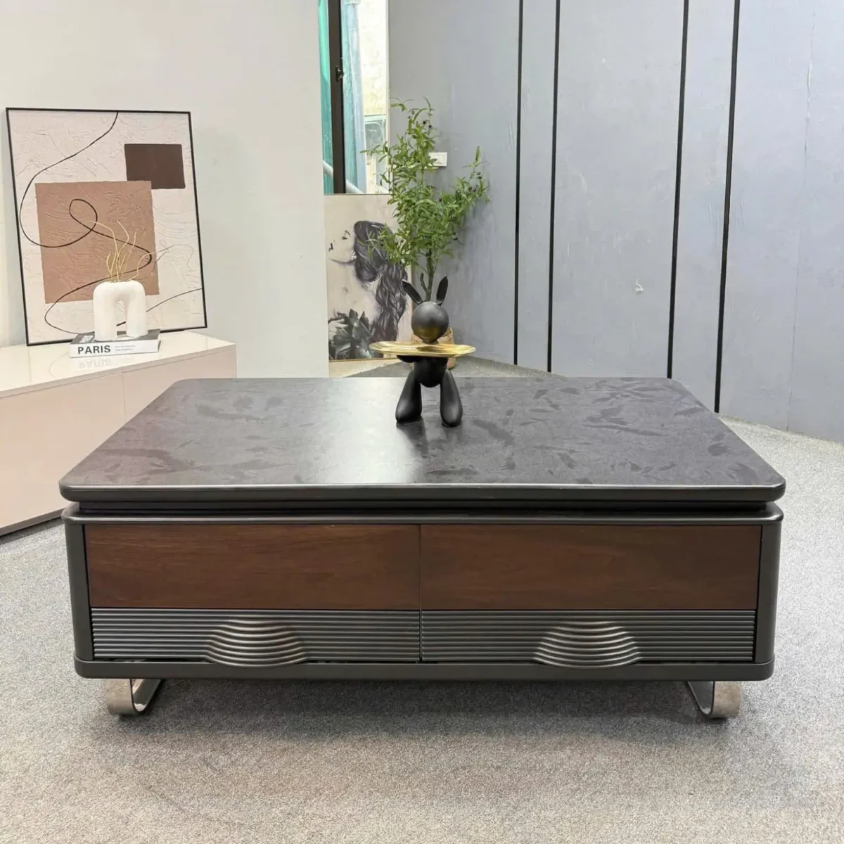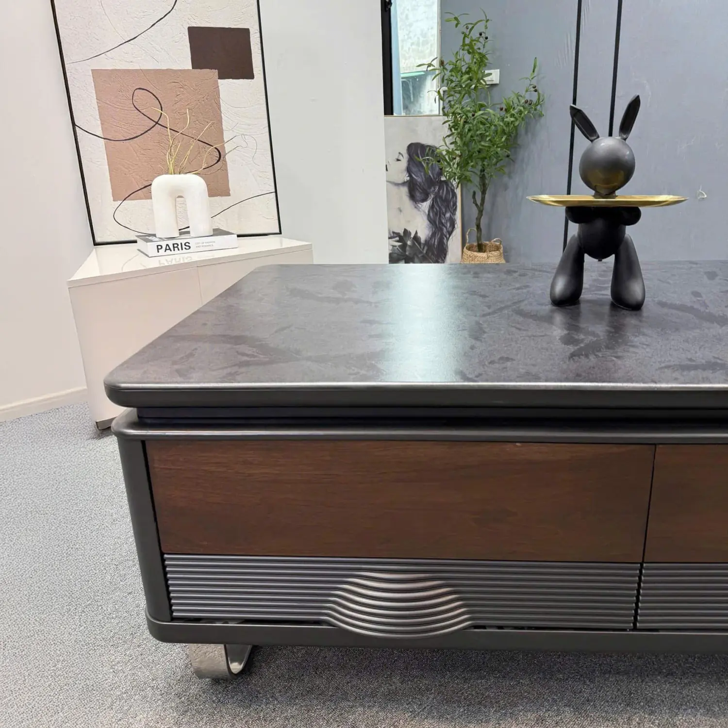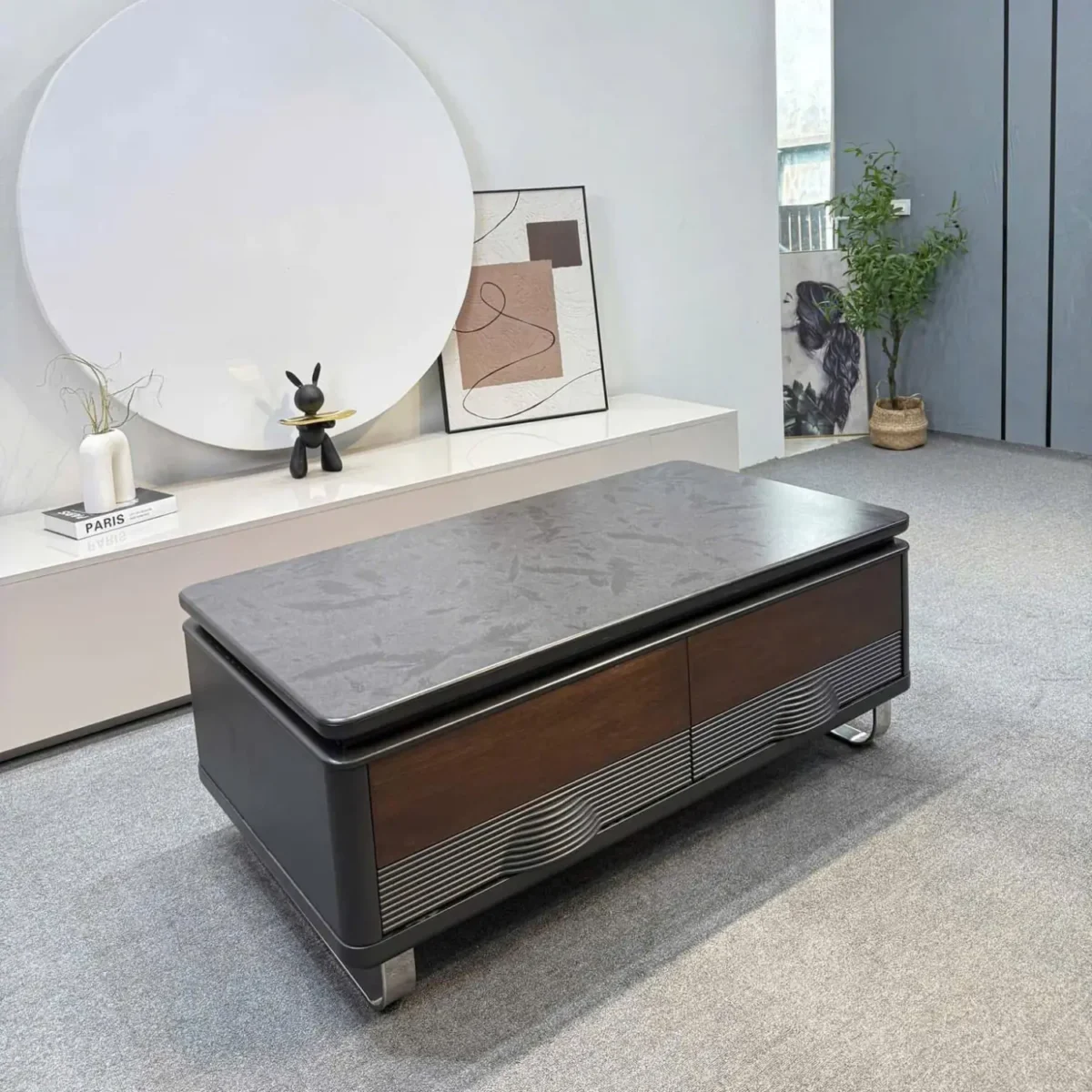 Kiểu dáng: Dạng hình hộp chữ nhật bo tròn, có ngăn kéo lưu trữ tiện lợi, khung liền khối chắc chắn – dễ kết hợp cùng bàn trà hiện đại hoặc bàn trà mặt đá đồng bộ phong cách.