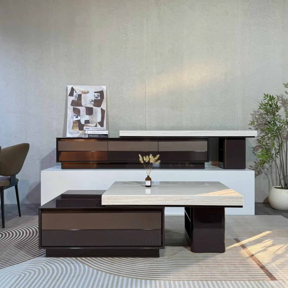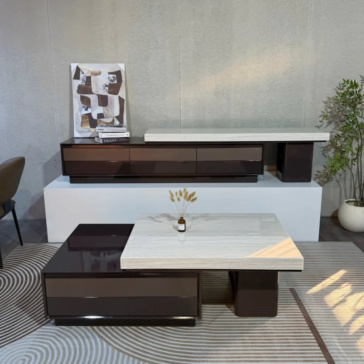 Bàn trà có thể kết hợp đồng bộ với kệ tivi phòng khách cùng tông màu để tạo nên không gian tiếp khách thống nhất và đẳng cấp.