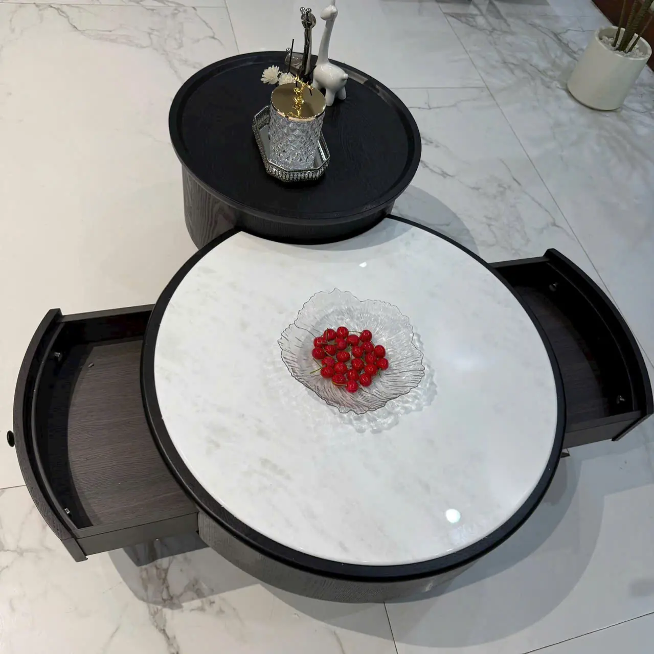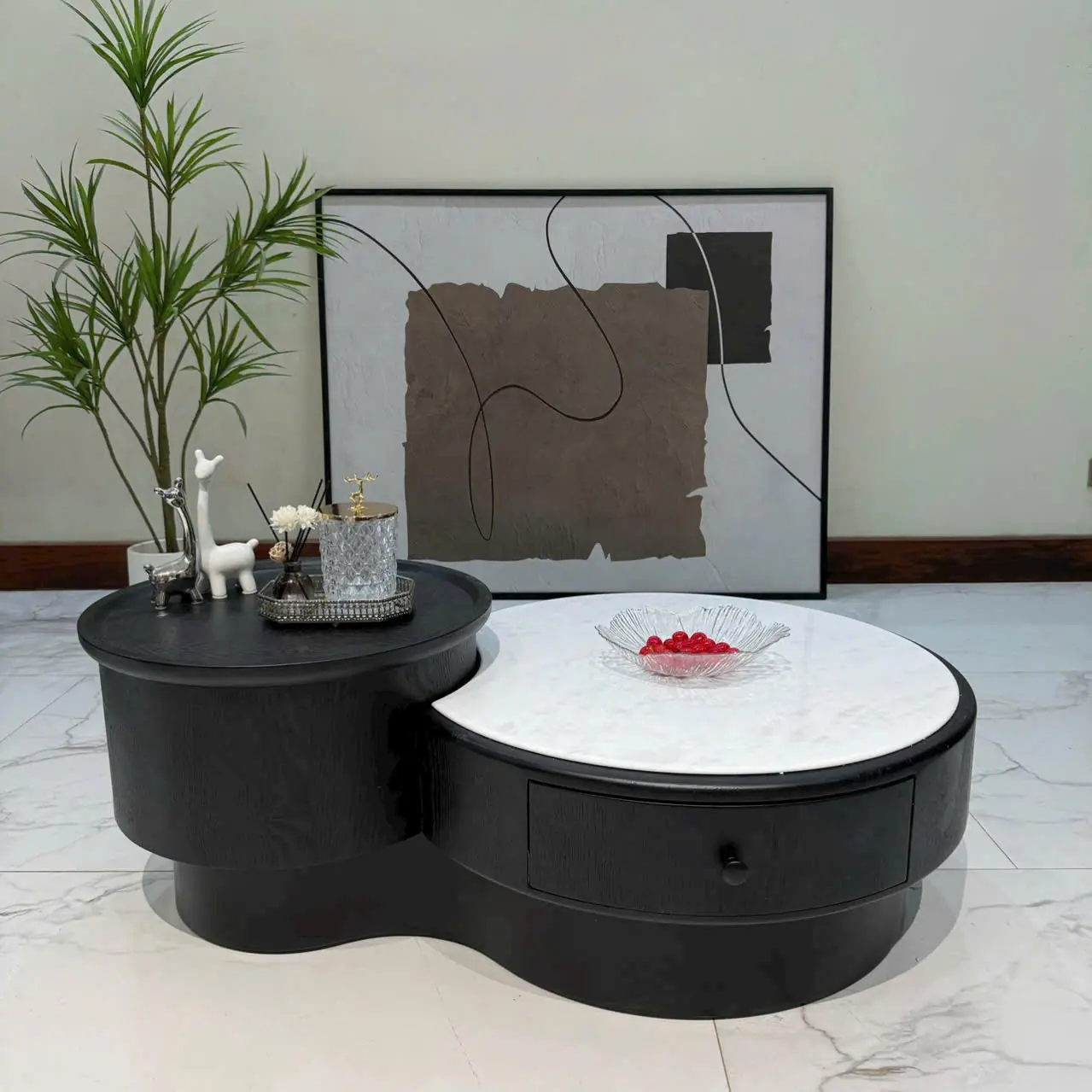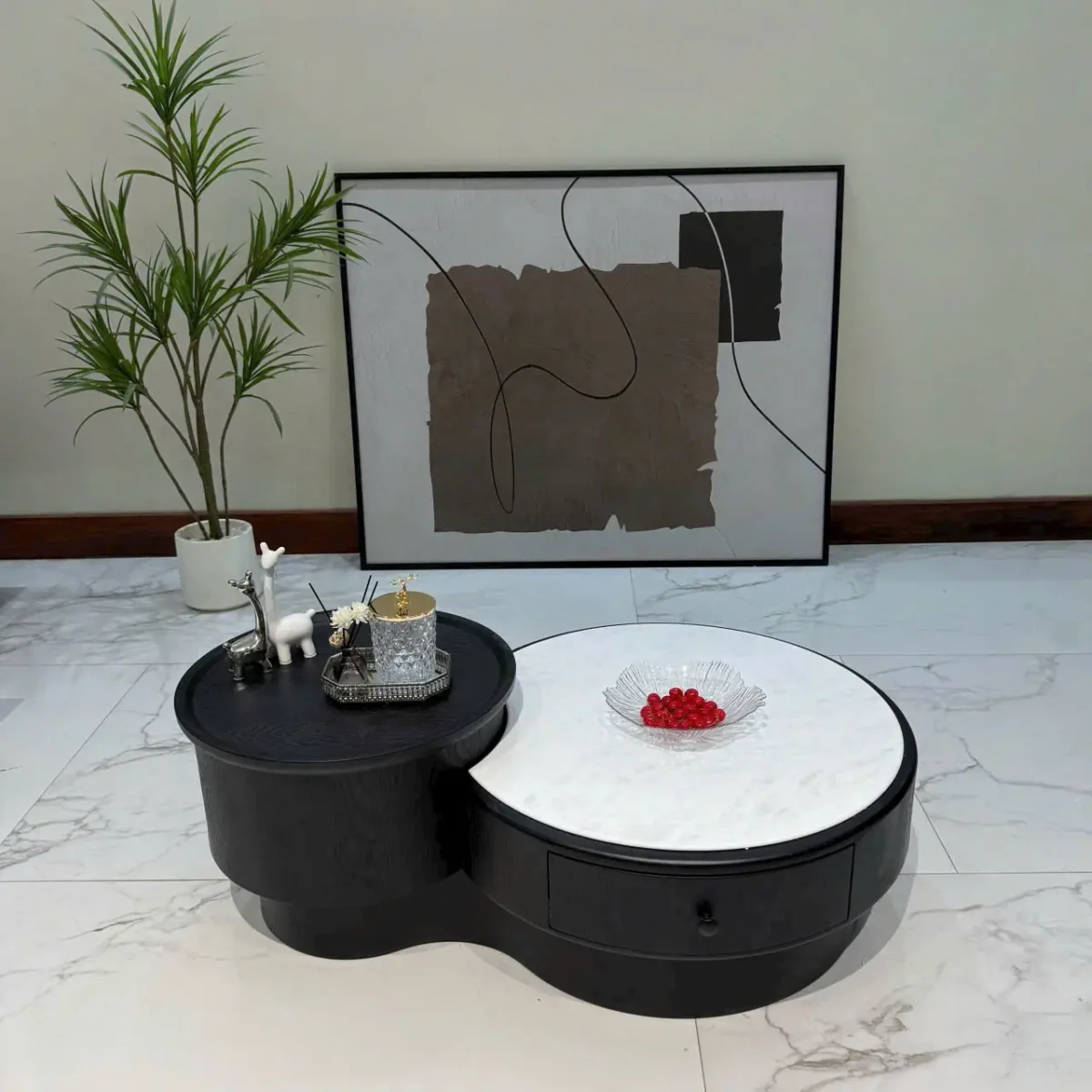 Bàn Trà Tròn Kép Mặt Đá Phối Gỗ Cao Cấp – Thiết Kế Bo Tròn, Sang Trọng & Tối Ưu Không Gian