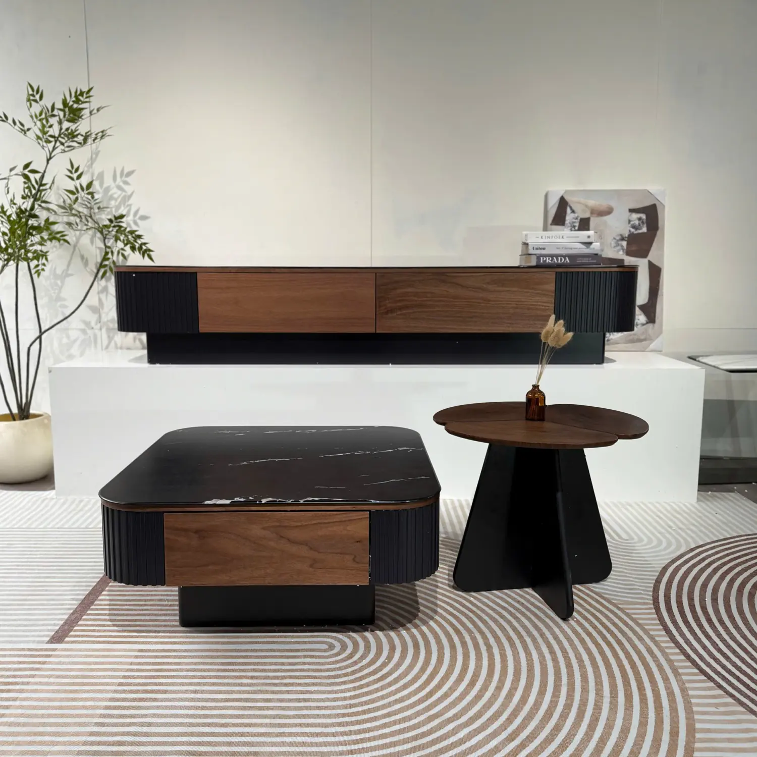 Kệ TV đi kèm có kích thước 200 × 40 × 38 cm, thiết kế tối giản với sự phối hợp hài hòa giữa gỗ óc chó và các đường kẻ sọc dọc tinh tế. Toàn bộ bộ sản phẩm mang đến vẻ ngoài sang trọng, ấm áp nhưng vẫn rất hiện đại, dễ dàng trở thành điểm nhấn nổi bật cho không gian nội thất phòng khách.