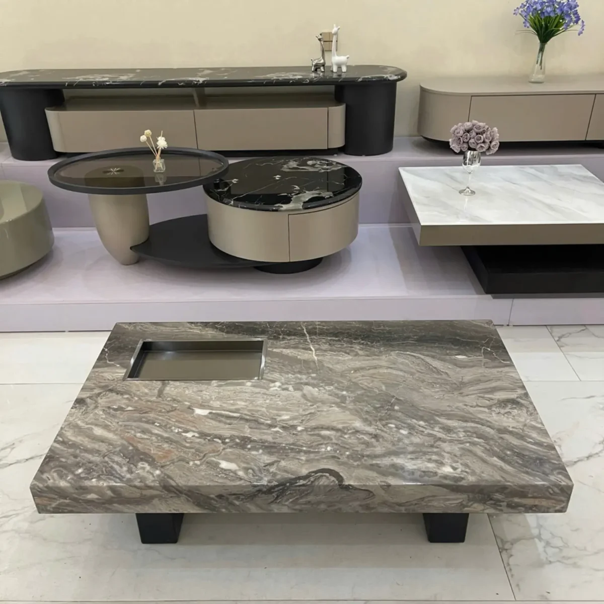 Ưu điểm nổi bật: Thiết kế hiện đại, mặt đá bền đẹp, dễ vệ sinh và tạo điểm nhấn cho phòng khách.