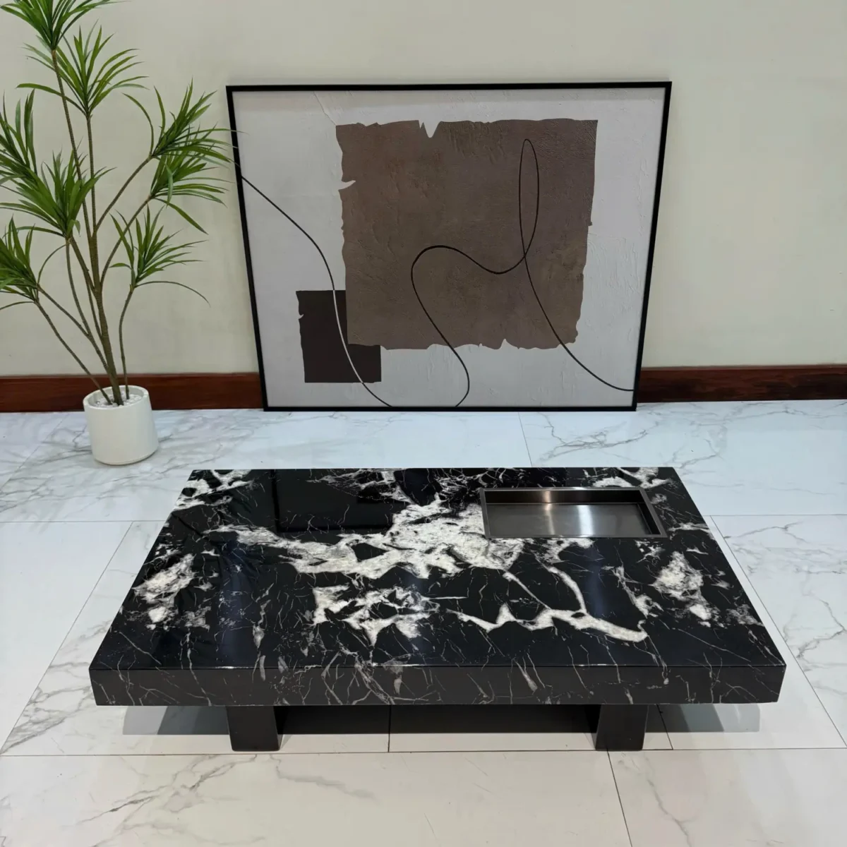 Màu đen vân đá sang trọng giúp bàn trà dễ dàng kết hợp với nhiều phong cách nội thất khác nhau, từ hiện đại đến tối giản.