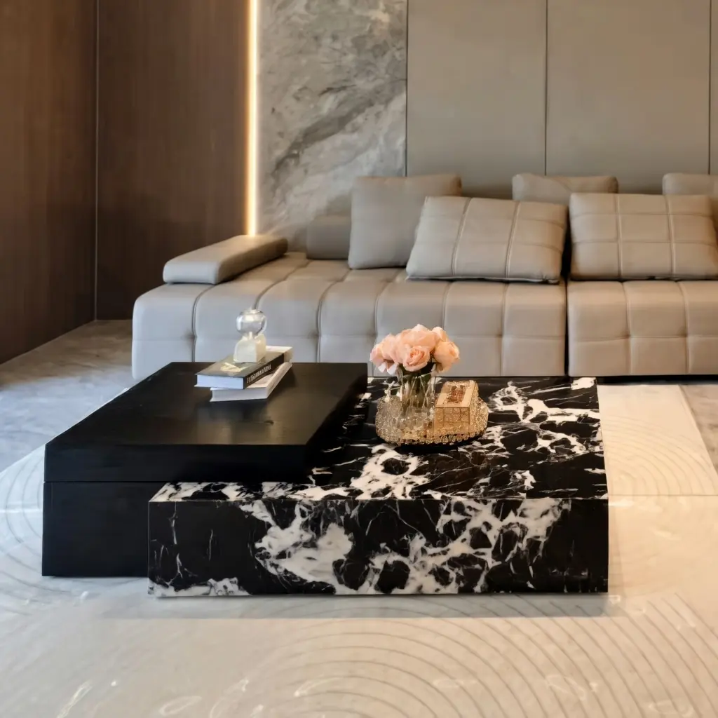 Bàn trà vuông mặt đá phối màu SP17378 là mẫu bàn trà phòng khách cao cấp mang phong cách hiện đại, nổi bật với thiết kế khối vuông mạnh mẽ cùng sự kết hợp giữa hai tông màu đá sang trọng. Sản phẩm không chỉ đóng vai trò là bàn trà tiện dụng mà còn là điểm nhấn ấn tượng giúp nâng tầm thẩm mỹ cho không gian phòng khách.