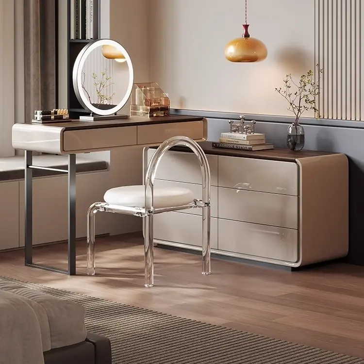 Bàn trang điểm gỗ tích hợp tủ lưu trữ thanh lịch là lựa chọn hoàn hảo cho những ai yêu thích sự tinh tế, gọn gàng và tiện dụng trong phòng ngủ. Thiết kế liền tủ rộng rãi giúp tối ưu hóa không gian sử dụng, đồng thời tạo điểm nhấn sang trọng cho căn phòng. Tông màu trang nhã, bề mặt phủ bóng chống trầy cùng form bo cong mềm mại mang đến tổng thể hài hòa, hiện đại. Khách có thể xem thêm nhiều mẫu cùng phong cách tại
