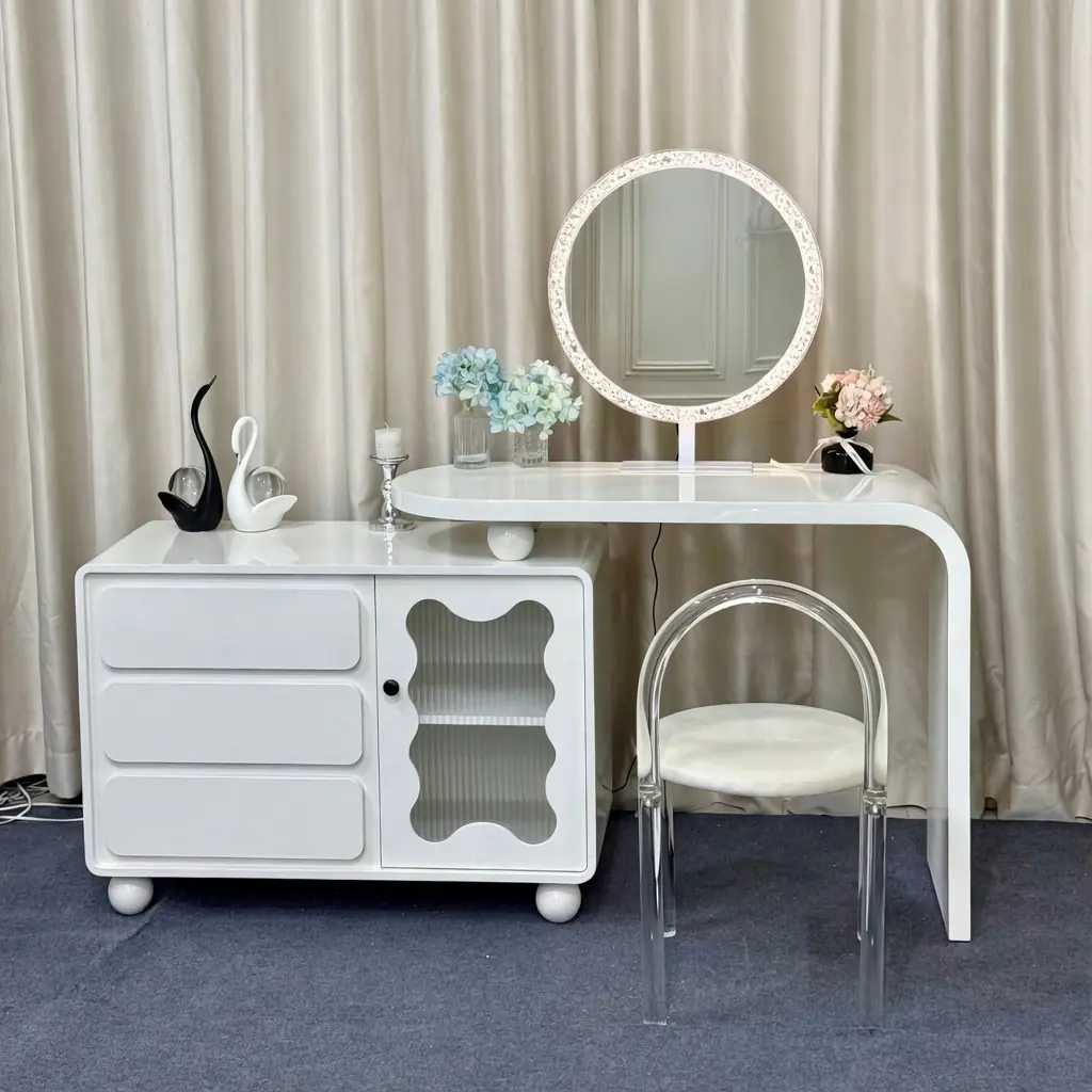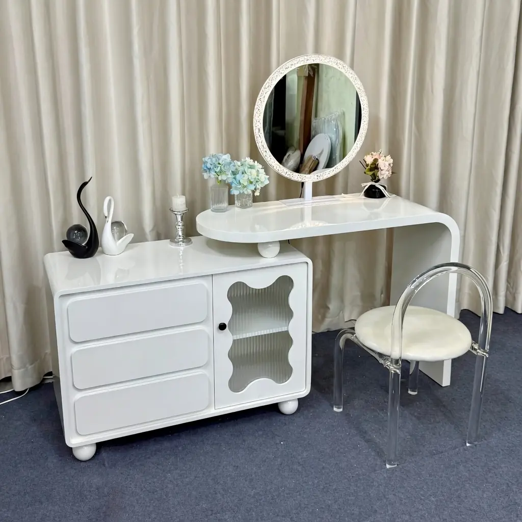 Bàn có kích thước dài 120 cm × sâu 45 cm × cao 75 cm, mặt bàn trắng bóng cao cấp chống xước tốt. Phần tủ phụ bên dưới rộng 60 cm × cao 80 cm với 3 ngăn kéo tiện lợi và 1 cánh kính gọn sóng trong suốt, giúp lưu trữ mỹ phẩm, phụ kiện và đồ dùng cá nhân một cách gọn gàng, dễ lấy. Gương tròn viền hoa văn trắng tinh tế tích hợp đèn LED (không kèm theo) tạo ánh sáng đều và đẹp khi trang điểm.