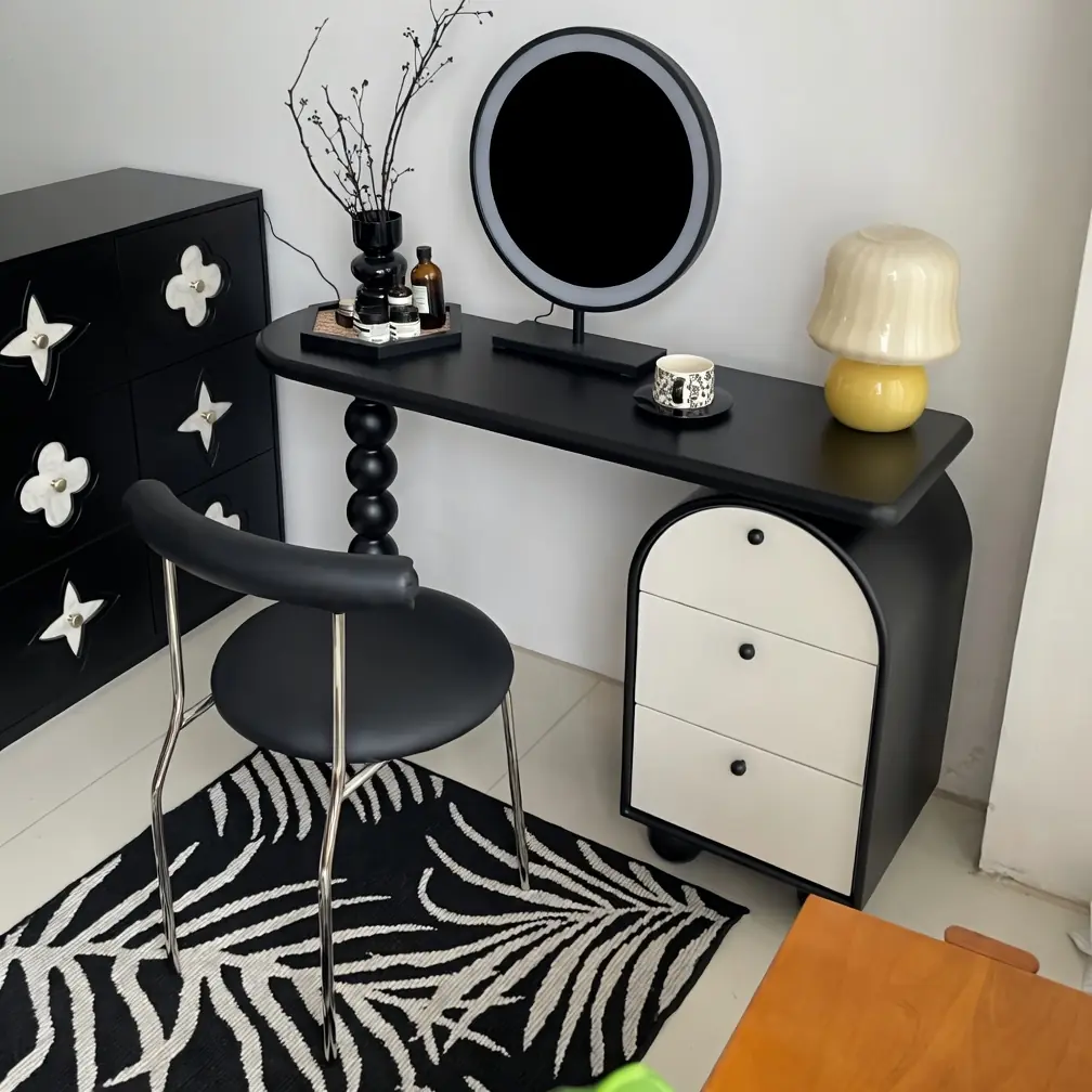 Bàn có kích thước dài 120 cm × sâu 45 cm × cao 75 cm, mặt bàn chống xước cao cấp màu đen bóng sang trọng. Phần tủ phụ bên dưới được sơn trắng viền đen tinh tế với 3 ngăn kéo rộng rãi, dễ dàng lưu trữ mỹ phẩm, phụ kiện và đồ dùng cá nhân. Ghế ngồi đi kèm thiết kế hiện đại với chân inox chắc chắn và đệm da mềm mại, mang lại cảm giác thoải mái khi trang điểm.