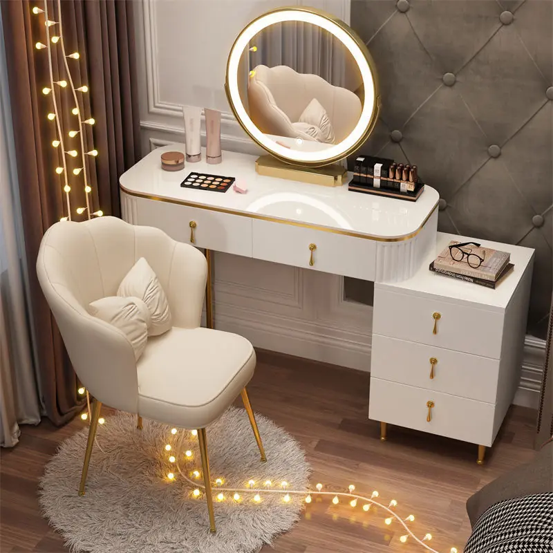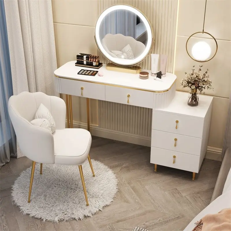 Ngăn kéo: 3 ngăn tủ lớn + 2 ngăn bàn, tay nắm đồng màu mạ vàng cao cấp, giúp lưu trữ mỹ phẩm và phụ kiện gọn gàng.