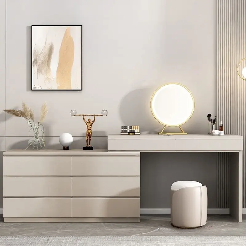 Điểm nổi bật của mẫu bàn này nằm ở kết cấu liền khối giữa bàn trang điểm và hệ tủ lưu trữ bên dưới. Nhờ đó, không gian sử dụng được tối ưu tối đa, vừa đảm bảo đầy đủ công năng trang điểm, vừa tăng khả năng lưu trữ mỹ phẩm, phụ kiện cá nhân một cách khoa học và ngăn nắp.