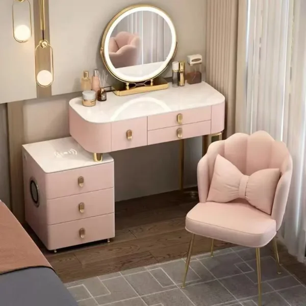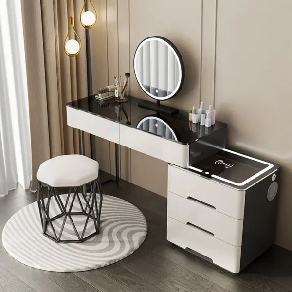 Điểm nổi bật của mẫu bàn này nằm ở kết cấu liền khối giữa bàn trang điểm và hệ tủ lưu trữ bên dưới. Nhờ đó, không gian sử dụng được tối ưu tối đa, vừa đảm bảo đầy đủ công năng trang điểm, vừa tăng khả năng lưu trữ mỹ phẩm, phụ kiện cá nhân một cách khoa học và ngăn nắp.