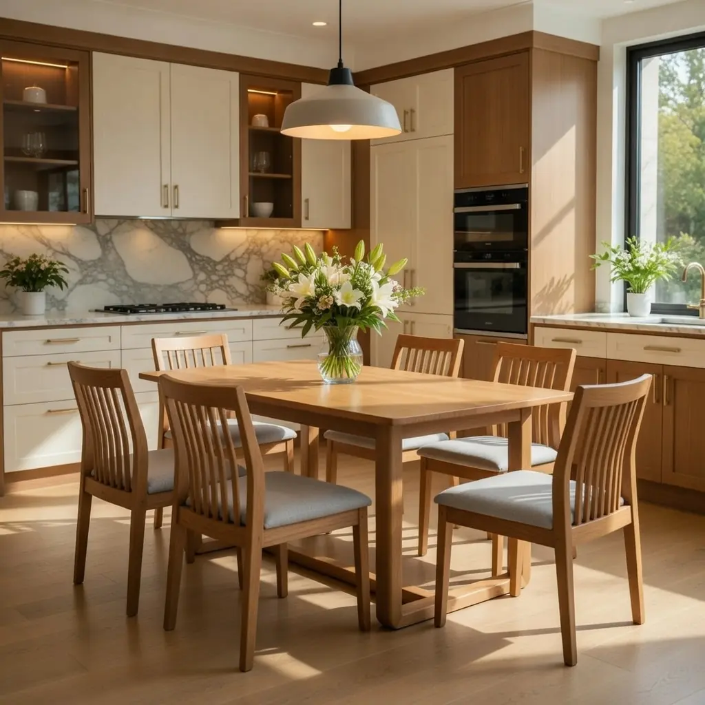 Ghế: 4 ghế gỗ cao cấp, tựa lưng thoải mái, đệm ngồi êm ái.