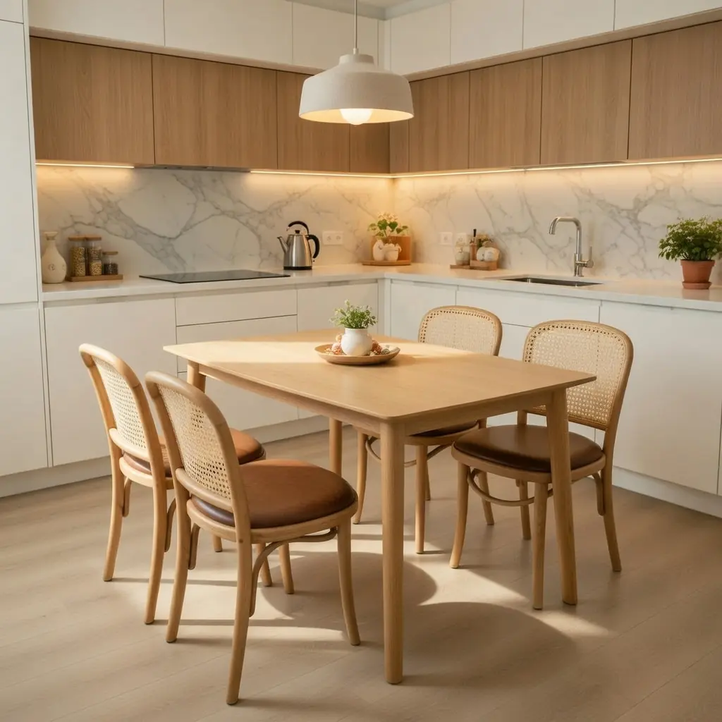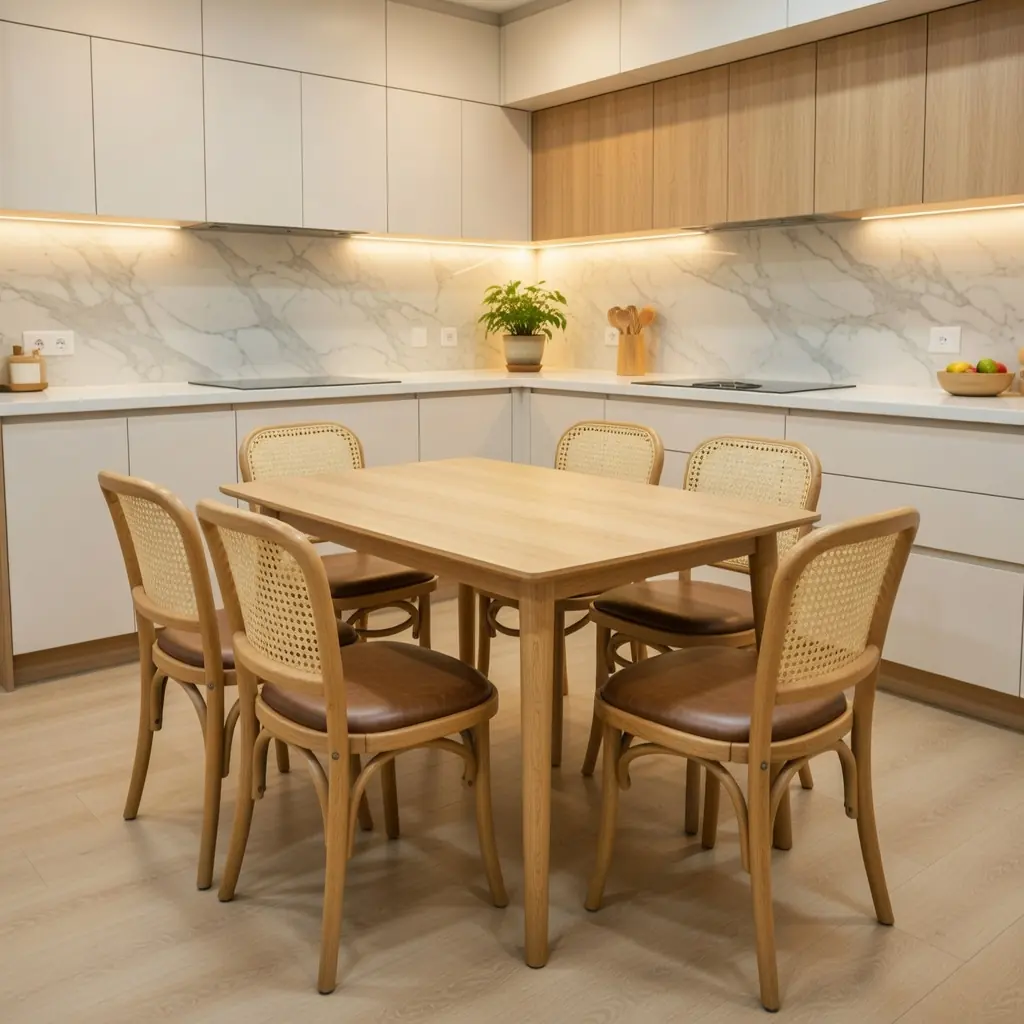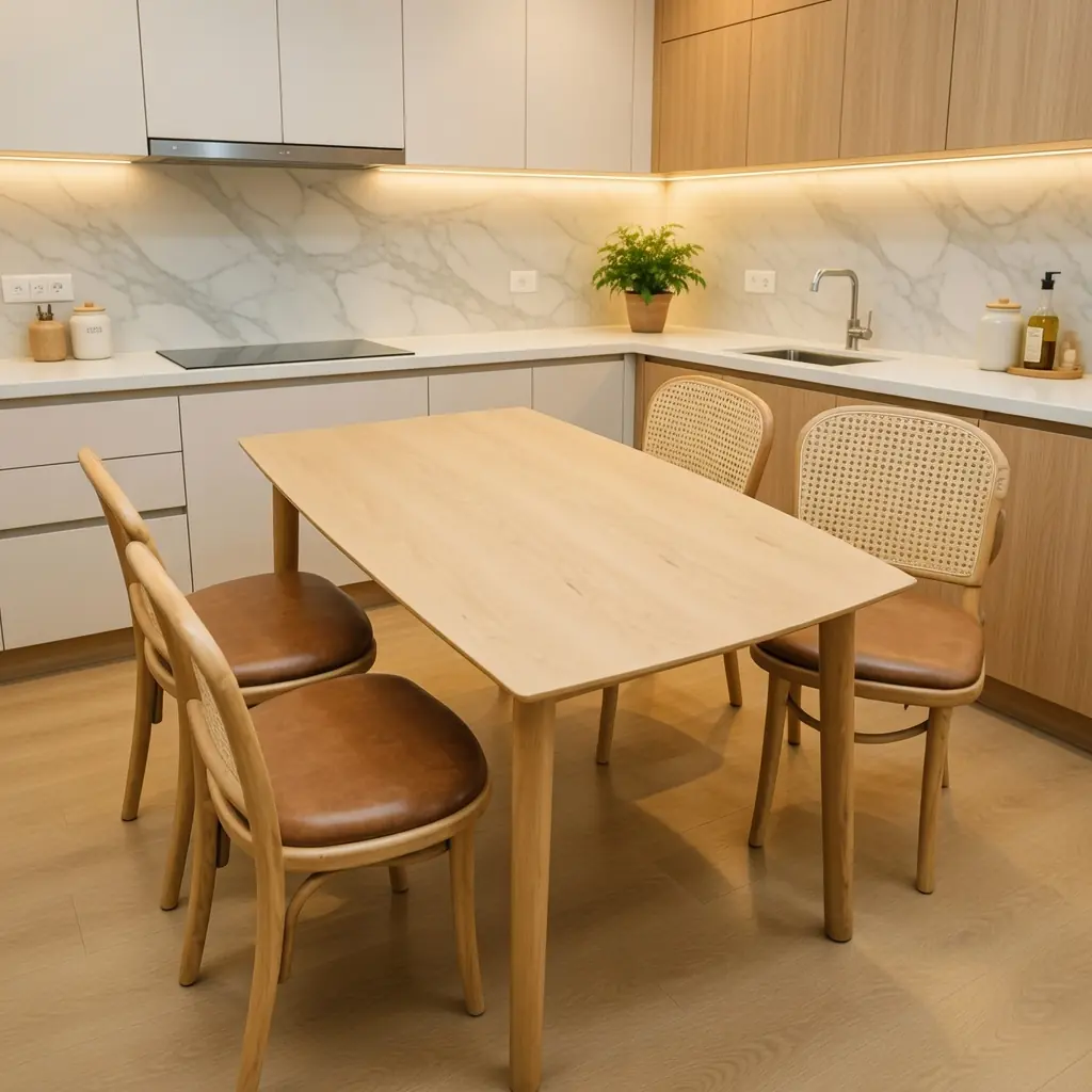 Mẫu bàn ăn gỗ tự nhiên 4 ghế cao cấp được chế tác từ gỗ tần bì bền đẹp, giữ nguyên vân gỗ sang trọng. Ghế đi kèm đệm da êm ái, tựa mây thoáng mát, mang đến sự thoải mái và tinh tế cho phòng bếp gia đình. Thiết kế đơn giản nhưng vẫn toát lên phong cách hiện đại – rustic đầy ấm cúng.