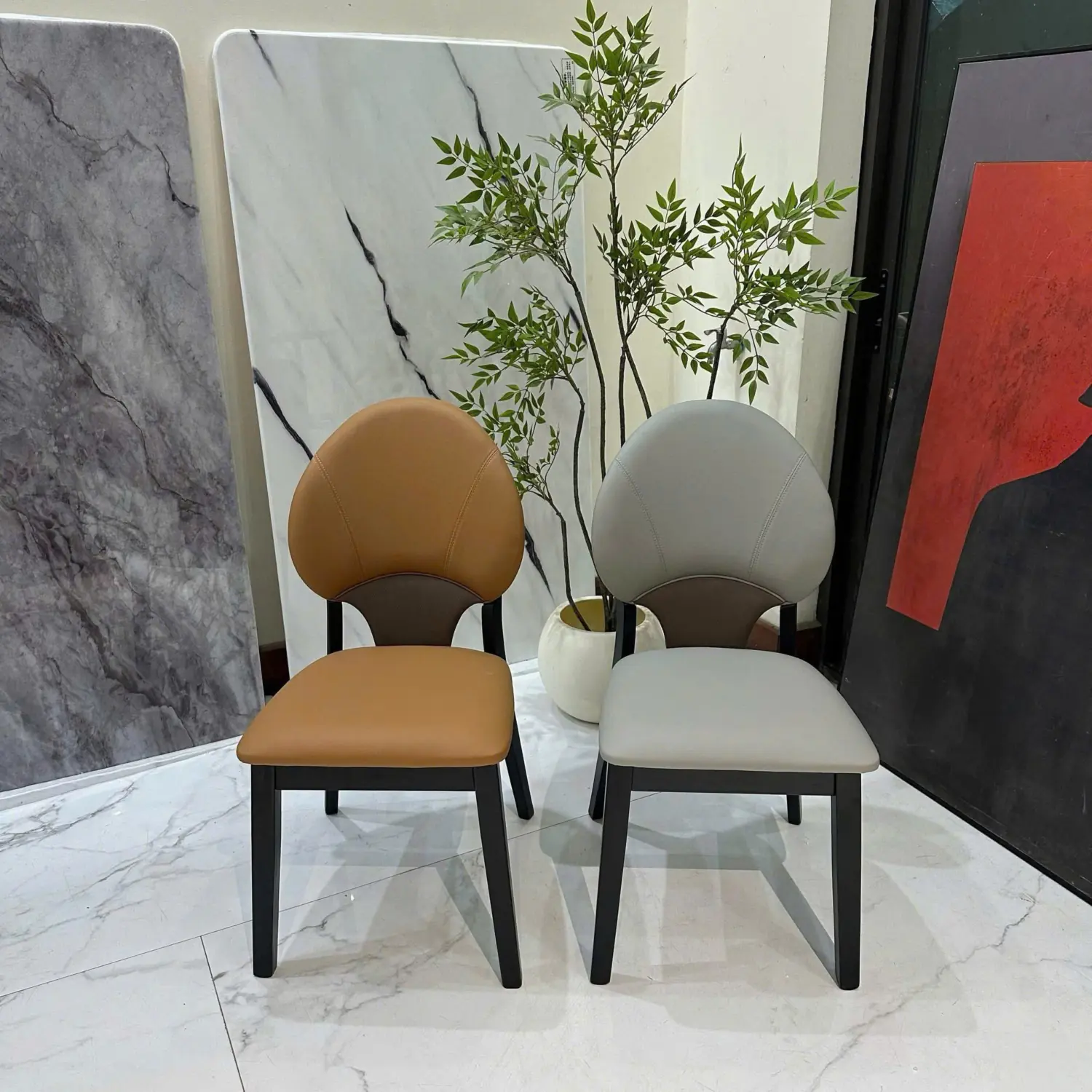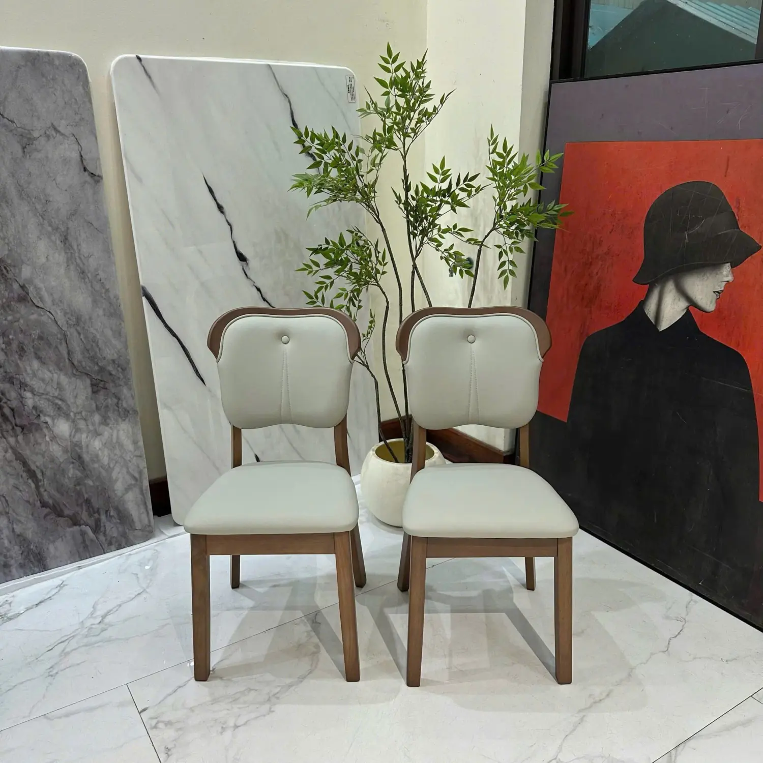 Ghế ăn: Khung gỗ sồi tự nhiên, bọc da PU cao cấp, đệm mút D40 êm ái, thiết kế ôm lưng giúp ngồi thoải mái.
