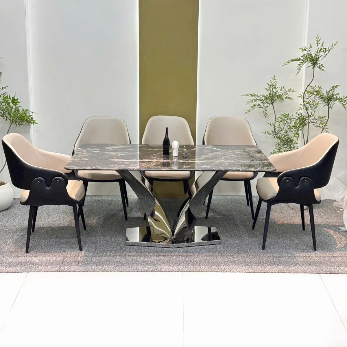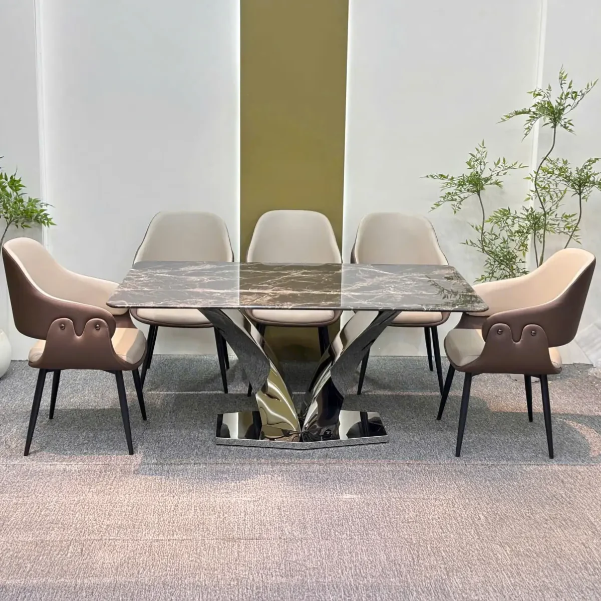 Kiểu dáng bàn chữ nhật quen thuộc nhưng được làm mới bằng hệ chân inox chữ V uốn cong cách điệu, giúp bộ bàn ăn không chỉ chắc chắn khi sử dụng mà còn mang giá trị thẩm mỹ cao, tạo cảm giác sang trọng ngay từ ánh nhìn đầu tiên.