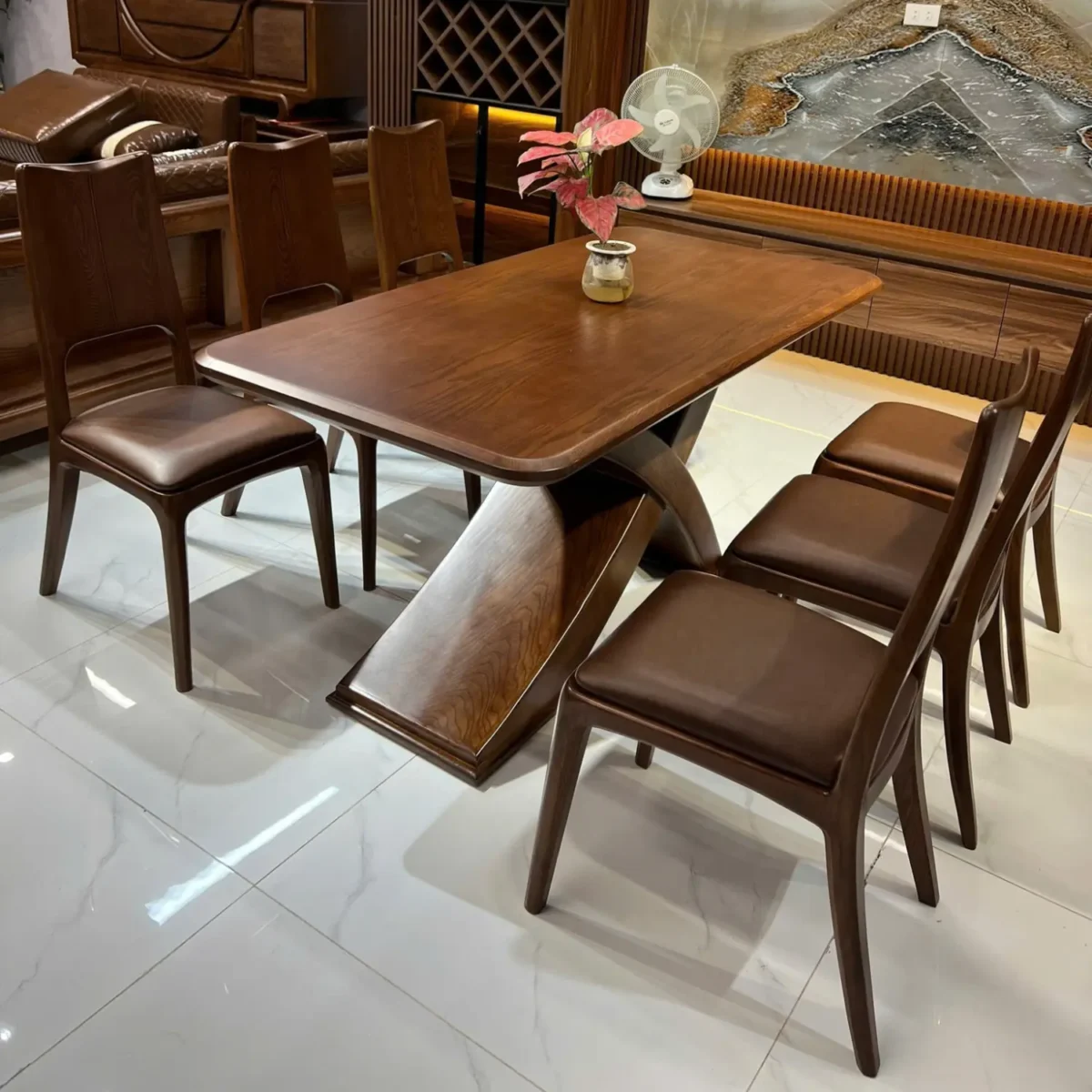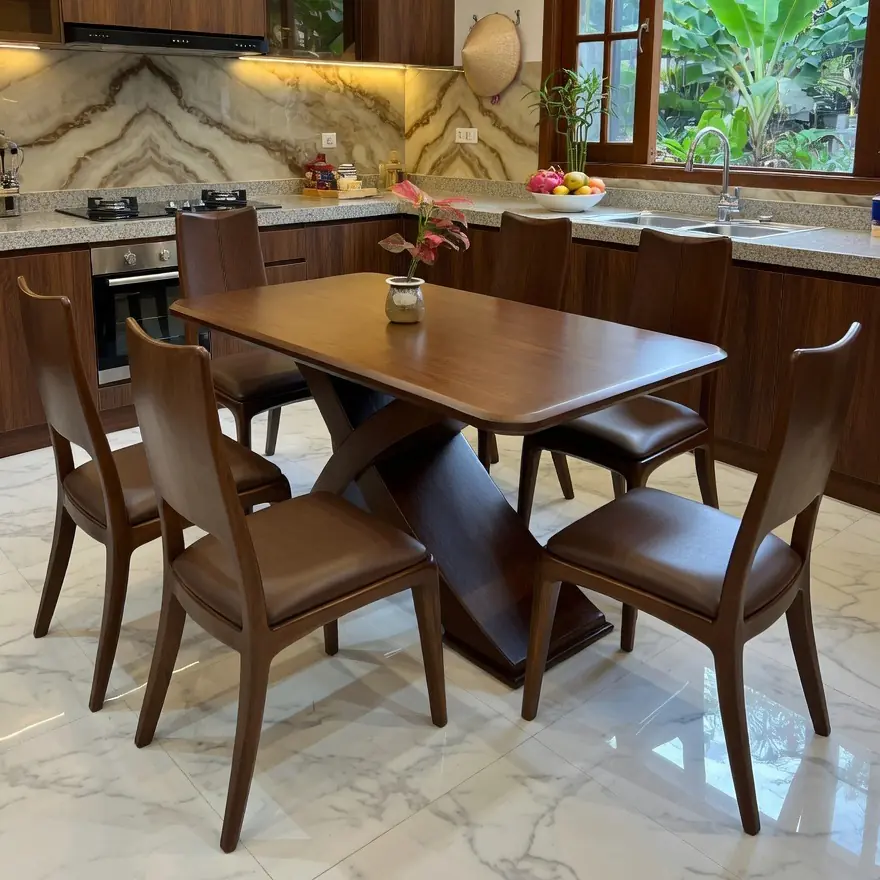Bộ bàn ăn 6 ghế gỗ sồi khuyết lưng chân chữ X cong cao cấp – SP2028