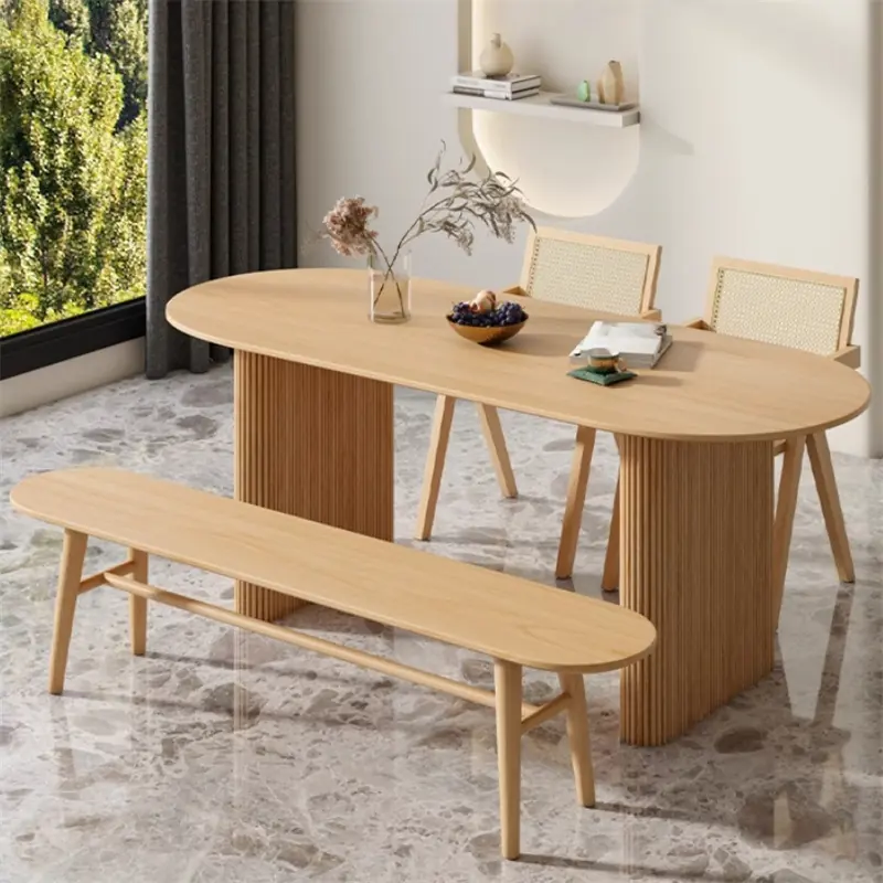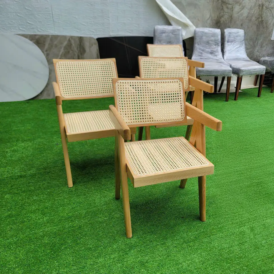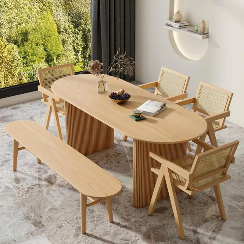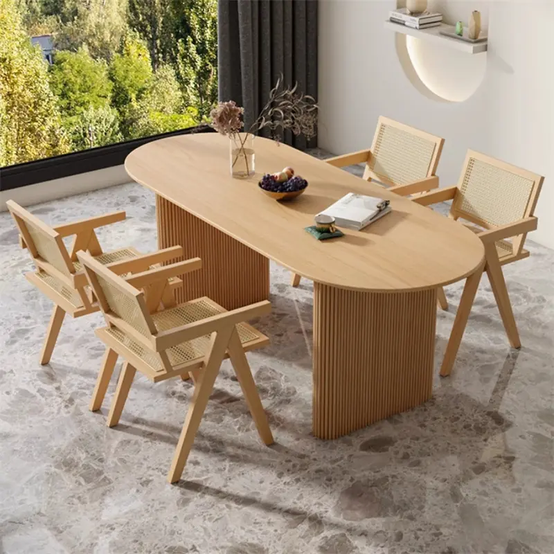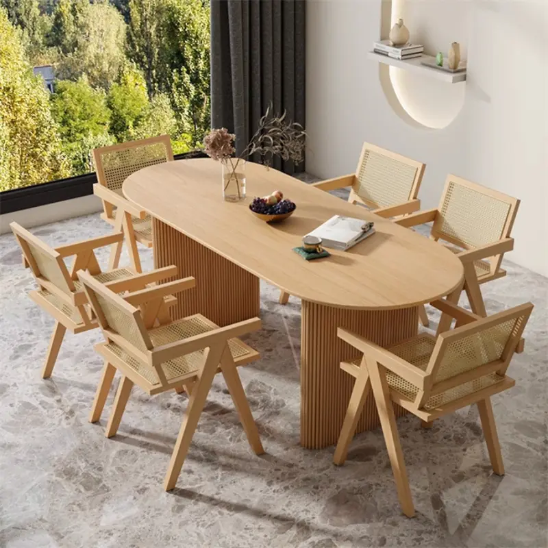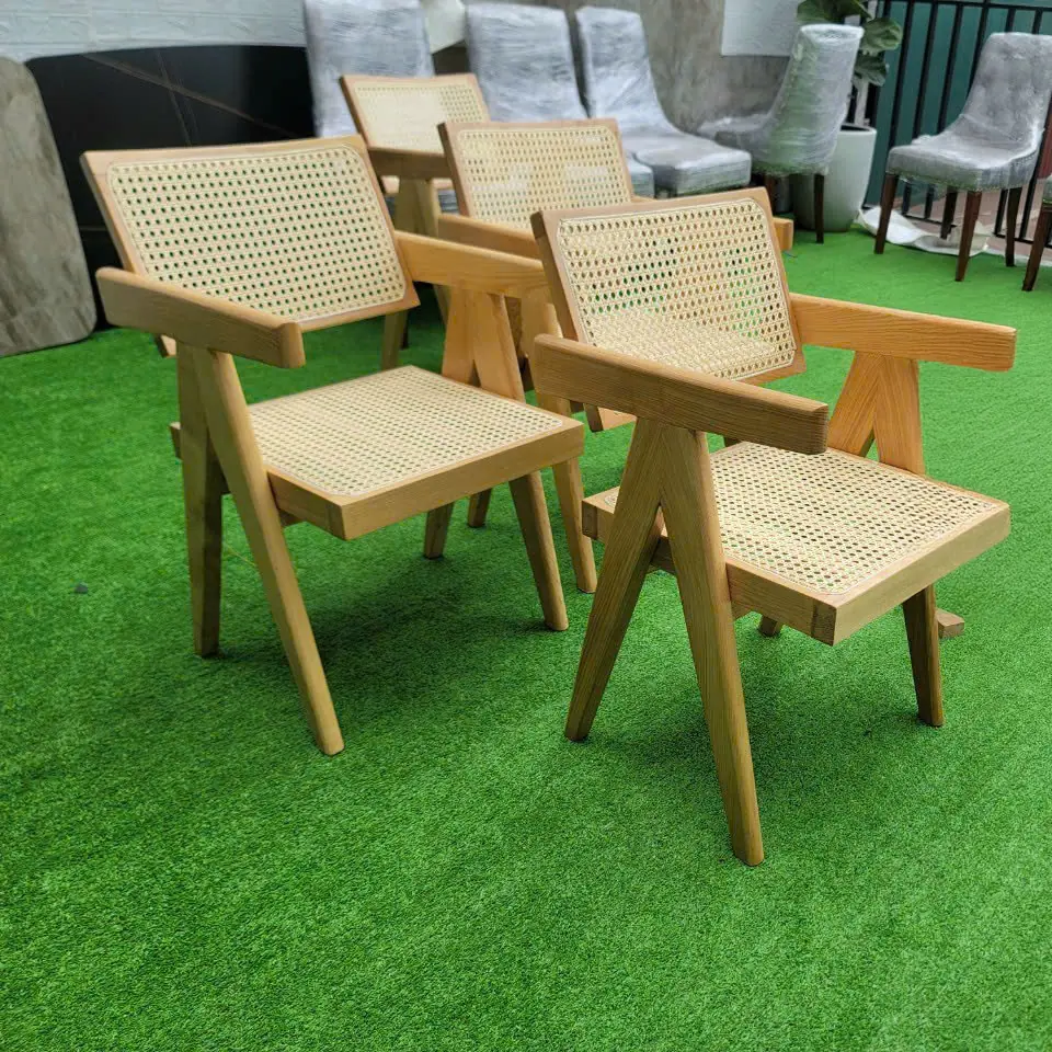 Bàn có kích thước từ 1m6 – 1m8, mặt bàn dáng oval mềm mại, đi kèm chân trụ chắc chắn tạo điểm nhấn sang trọng và vững chãi. Ghế thiết kế khung gỗ tần bì kết hợp mây đan thủ công, vừa thoáng mát, vừa mang lại cảm giác tự nhiên gần gũi nhưng vẫn tinh tế.