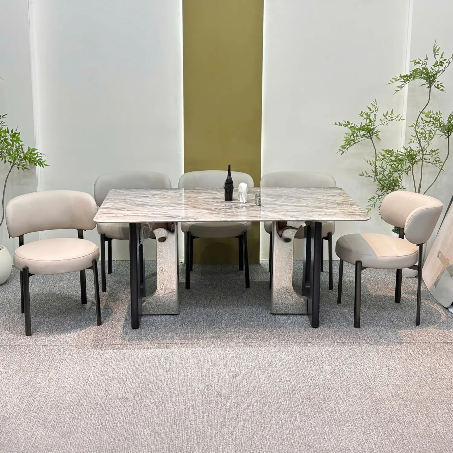 Phần chân bàn được gia công từ thép sơn tĩnh điện kết hợp trụ đá tạo điểm nhấn hiện đại và chắc chắn. Thiết kế chân bàn độc đáo giúp tăng độ ổn định, đồng thời mang lại vẻ đẹp sang trọng cho toàn bộ bộ bàn ăn.