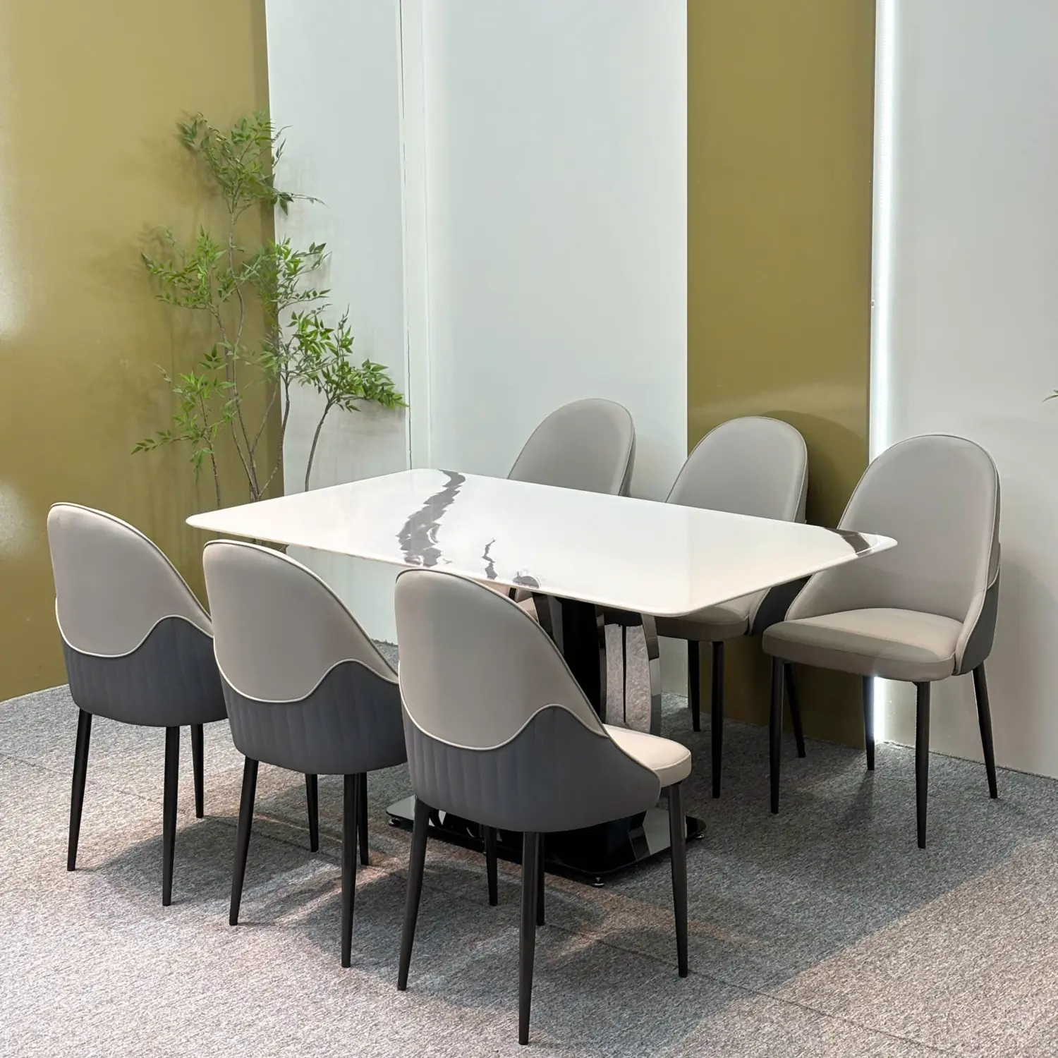 Mẫu bàn ăn mặt đá vi tinh thể kết hợp ghế ăn bọc da nhập khẩu là lựa chọn hoàn hảo cho không gian phòng ăn hiện đại. Mặt bàn vi tinh thể cao cấp với bề mặt bóng mịn, sang trọng, tạo điểm nhấn ấn tượng và nâng tầm thẩm mỹ cho ngôi nhà.