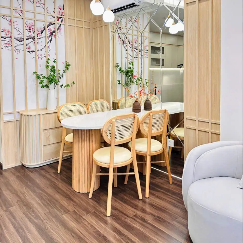 Ghế được thiết kế tựa lưng mây độc đáo, vừa thoáng khí vừa tạo điểm nhấn tinh tế. Bàn có kích thước linh hoạt từ 1m2 – 1m4, dáng bàn oval mềm mại, chân trụ đôi chắc chắn, tôn lên vẻ cổ điển pha rustic cho không gian phòng ăn.