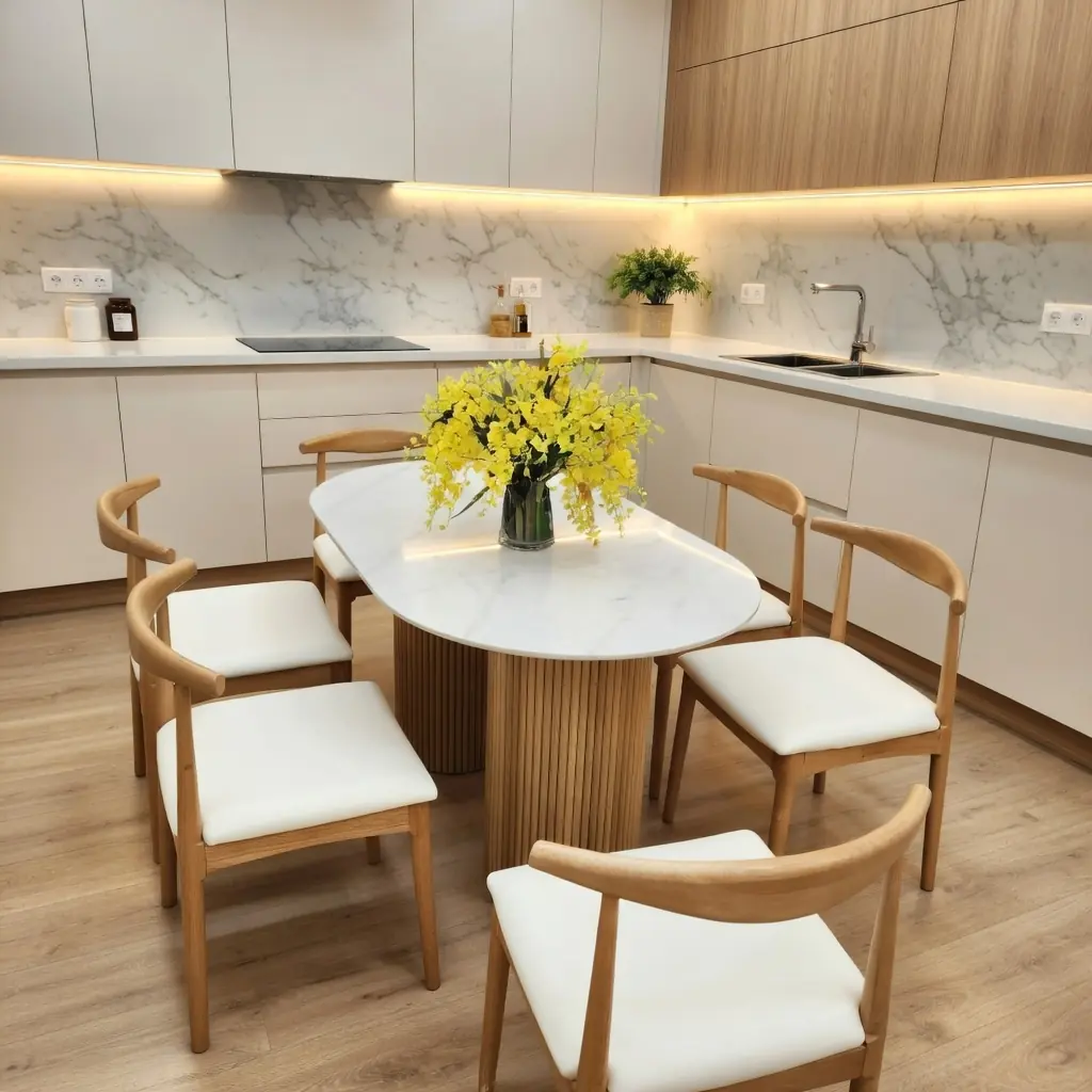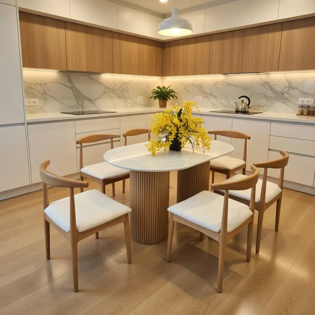 Mẫu bàn ăn gỗ tự nhiên kết hợp mặt đá ceramic cao cấp, mang đến không gian phòng ăn sự sang trọng, tinh tế và bền bỉ theo thời gian. Thiết kế bàn chữ nhật bo góc mềm mại cùng 6 ghế tựa lưng nan gỗ chắc chắn, phù hợp cho gia đình 4 – 6 người sử dụng hàng ngày hoặc tiếp khách.