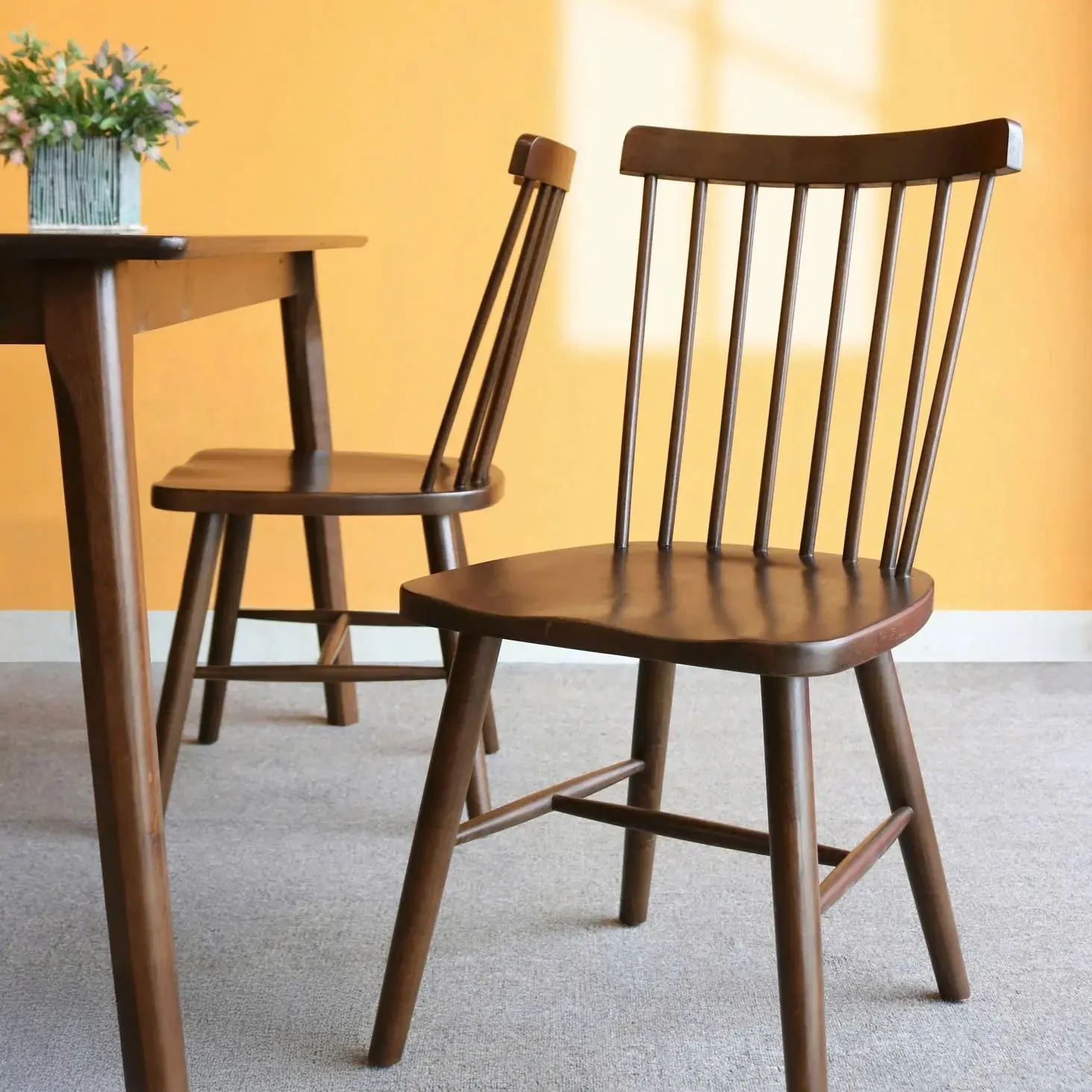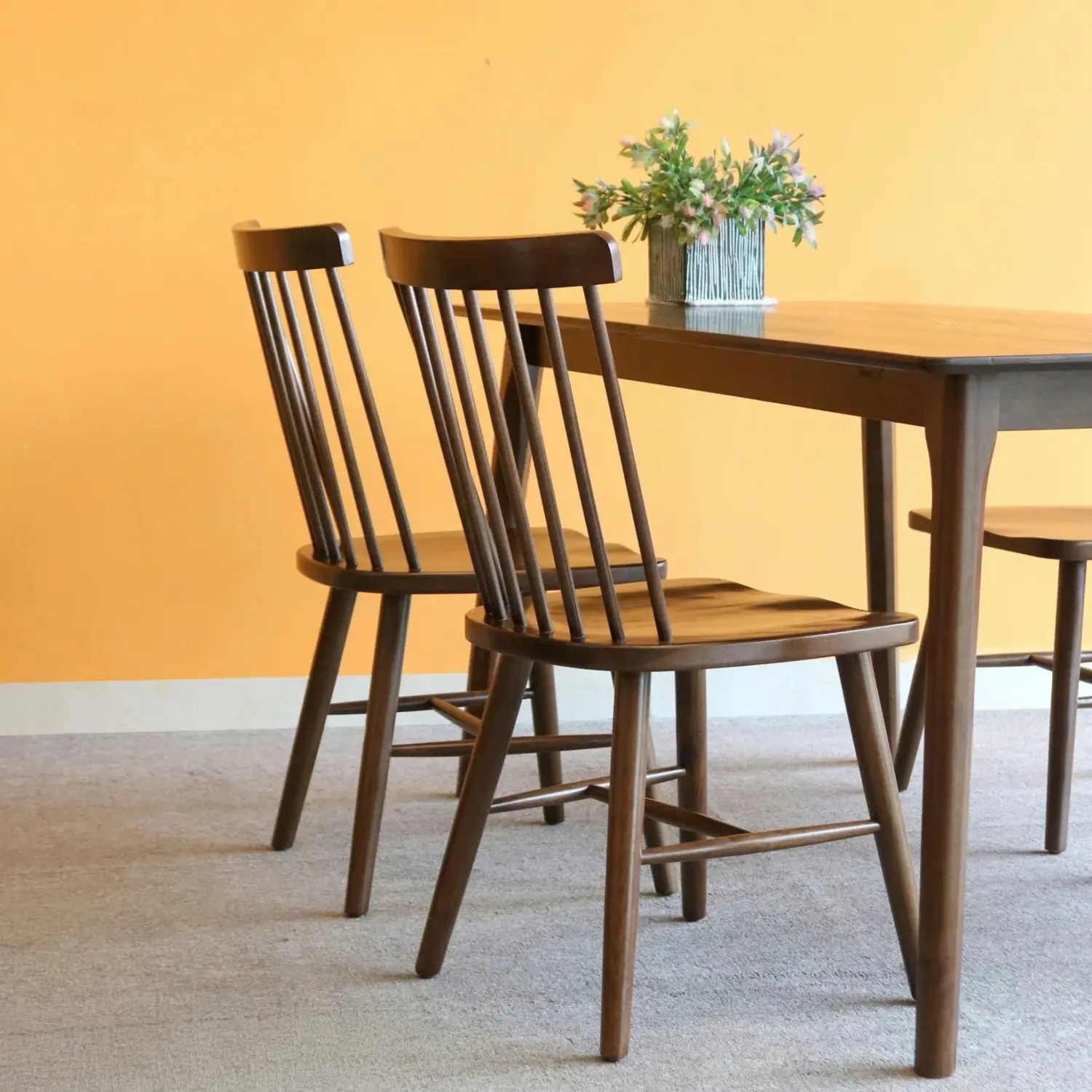 - Chất liệu ghế: Gỗ tự nhiên đồng bộ, tựa lưng nan cong nhẹ tạo cảm giác thoải mái khi ngồi.