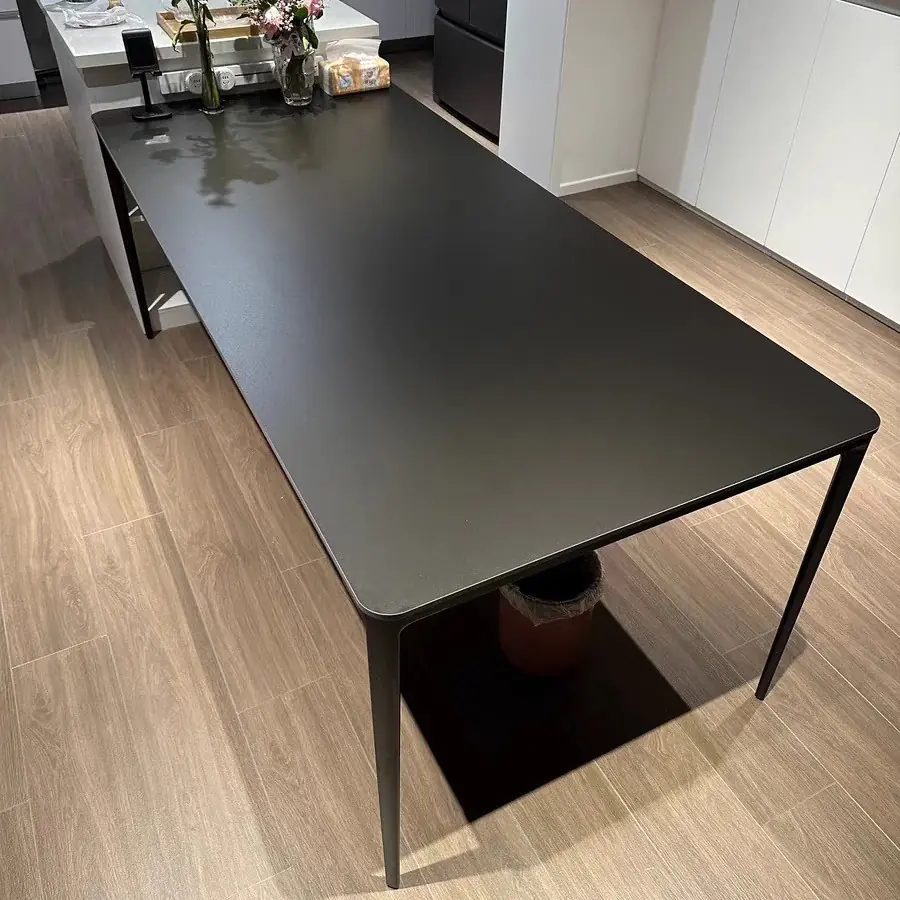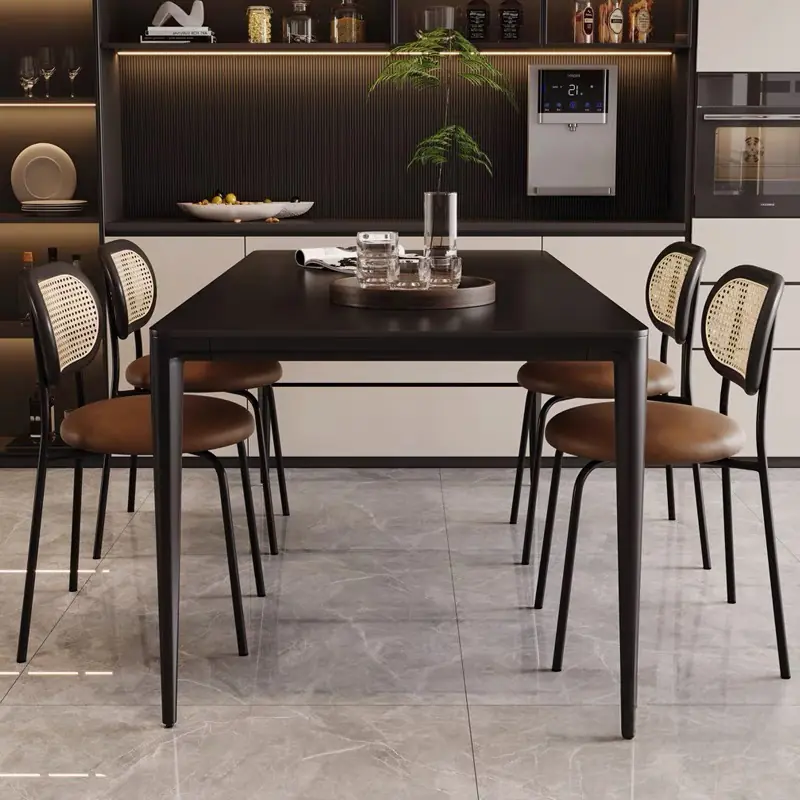Bàn sử dụng mặt bàn gỗ sơn đen mờ cao cấp, bề mặt phẳng mịn, dễ lau chùi và có khả năng chống bám bẩn tốt. Lớp sơn hoàn thiện kỹ lưỡng giúp bàn giữ được màu sắc bền đẹp theo thời gian, đồng thời mang lại cảm giác sang trọng, hiện đại cho không gian phòng ăn.