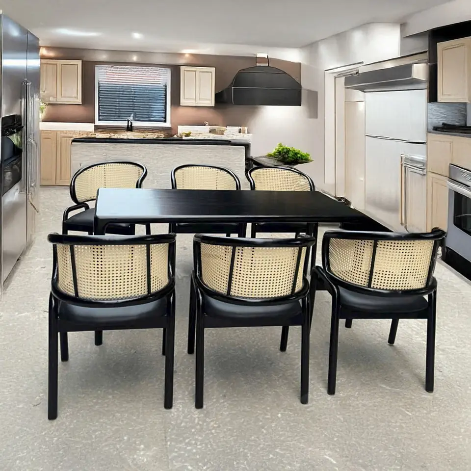 Bộ bàn ăn gỗ sơn đen cao cấp phong cách Bắc Âu SP14308 mang đến vẻ đẹp tối giản nhưng đầy tinh tế cho không gian phòng ăn hiện đại. Sự kết hợp hài hòa giữa gam màu đen sang trọng và chi tiết ghế mây đan thủ công giúp bộ bàn ăn tạo điểm nhấn khác biệt, phù hợp với xu hướng nội thất Bắc Âu thanh lịch.