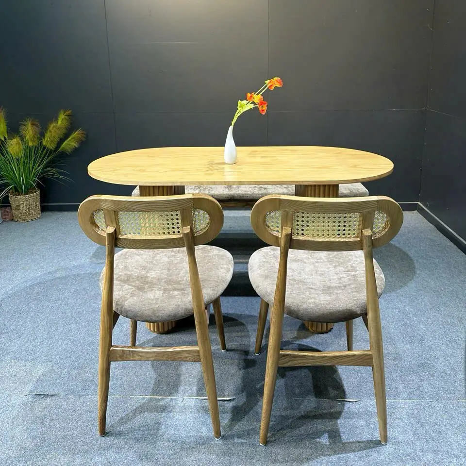 Bộ bàn ăn gỗ tần bì ghế lót nệm mang phong cách Rustic cao cấp là lựa chọn lý tưởng cho những không gian yêu thích sự mộc mạc nhưng vẫn tinh tế. Thiết kế mặt bàn oval bo cong mềm mại kết hợp chân trụ rãnh dọc độc đáo tạo nên tổng thể vừa hiện đại vừa gần gũi.