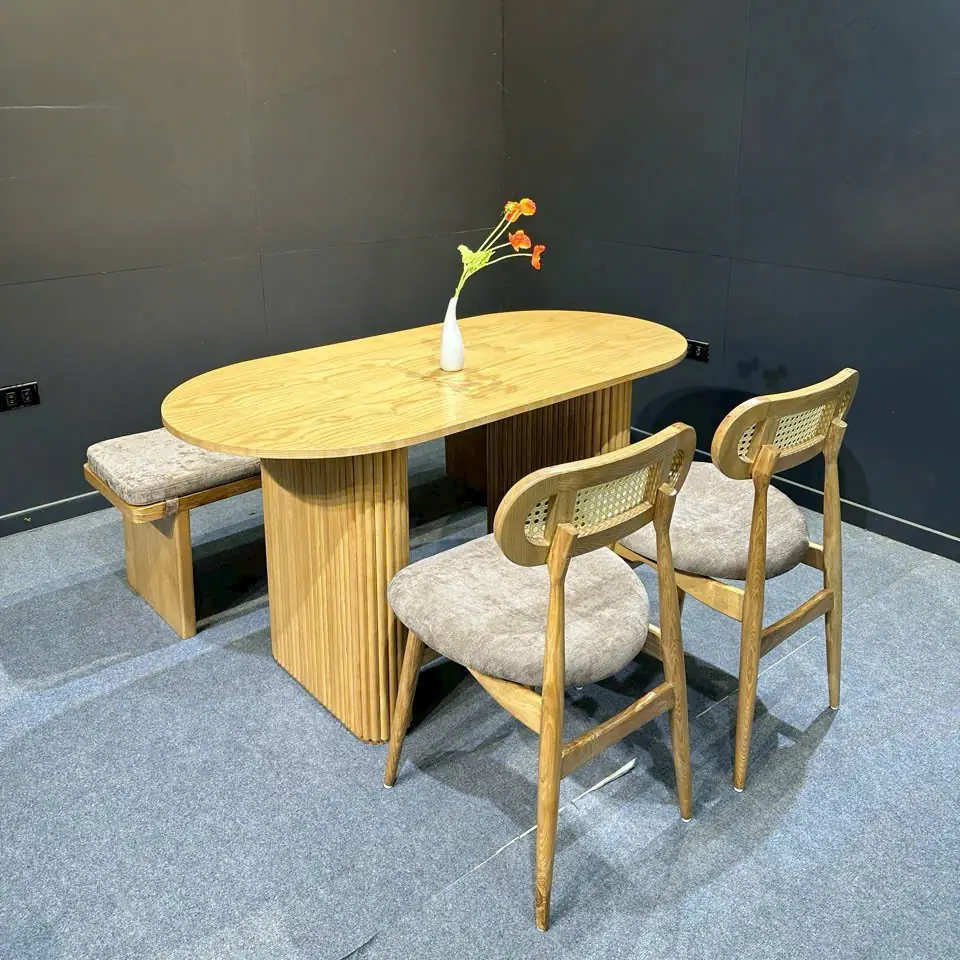 Mặt bàn hình oval mềm mại giúp tiết kiệm diện tích và hạn chế góc cạnh sắc nhọn. Kích thước tiêu chuẩn 1m4 × 80 cm phù hợp cho 2 ghế đơn và 1 ghế dài, đáp ứng nhu cầu sử dụng của gia đình nhỏ hoặc căn hộ diện tích vừa phải.