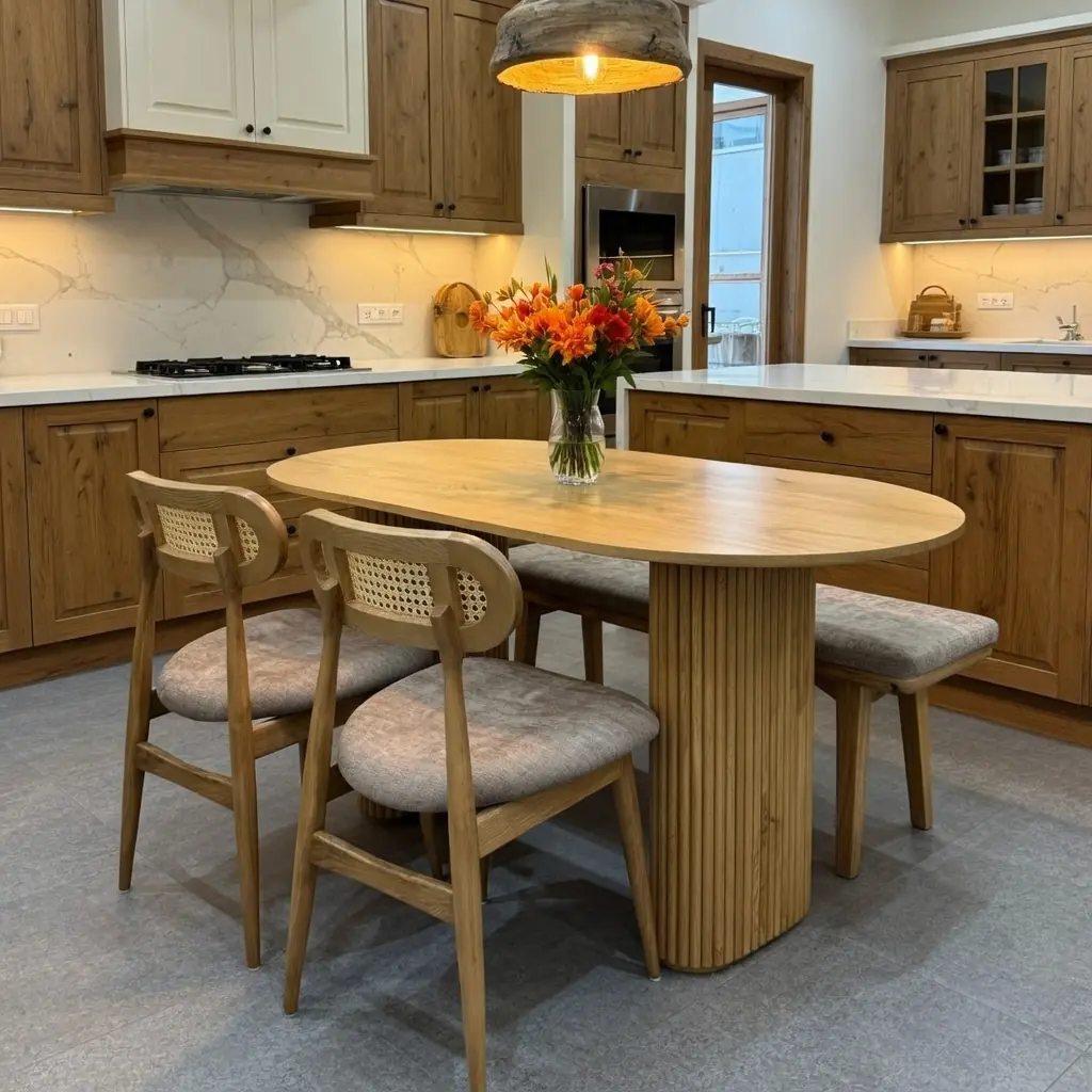 Bộ bàn ăn gỗ tần bì ghế lót nệm mang phong cách Rustic cao cấp là lựa chọn lý tưởng cho những không gian yêu thích sự mộc mạc nhưng vẫn tinh tế. Thiết kế mặt bàn oval bo cong mềm mại kết hợp chân trụ rãnh dọc độc đáo tạo nên tổng thể vừa hiện đại vừa gần gũi.