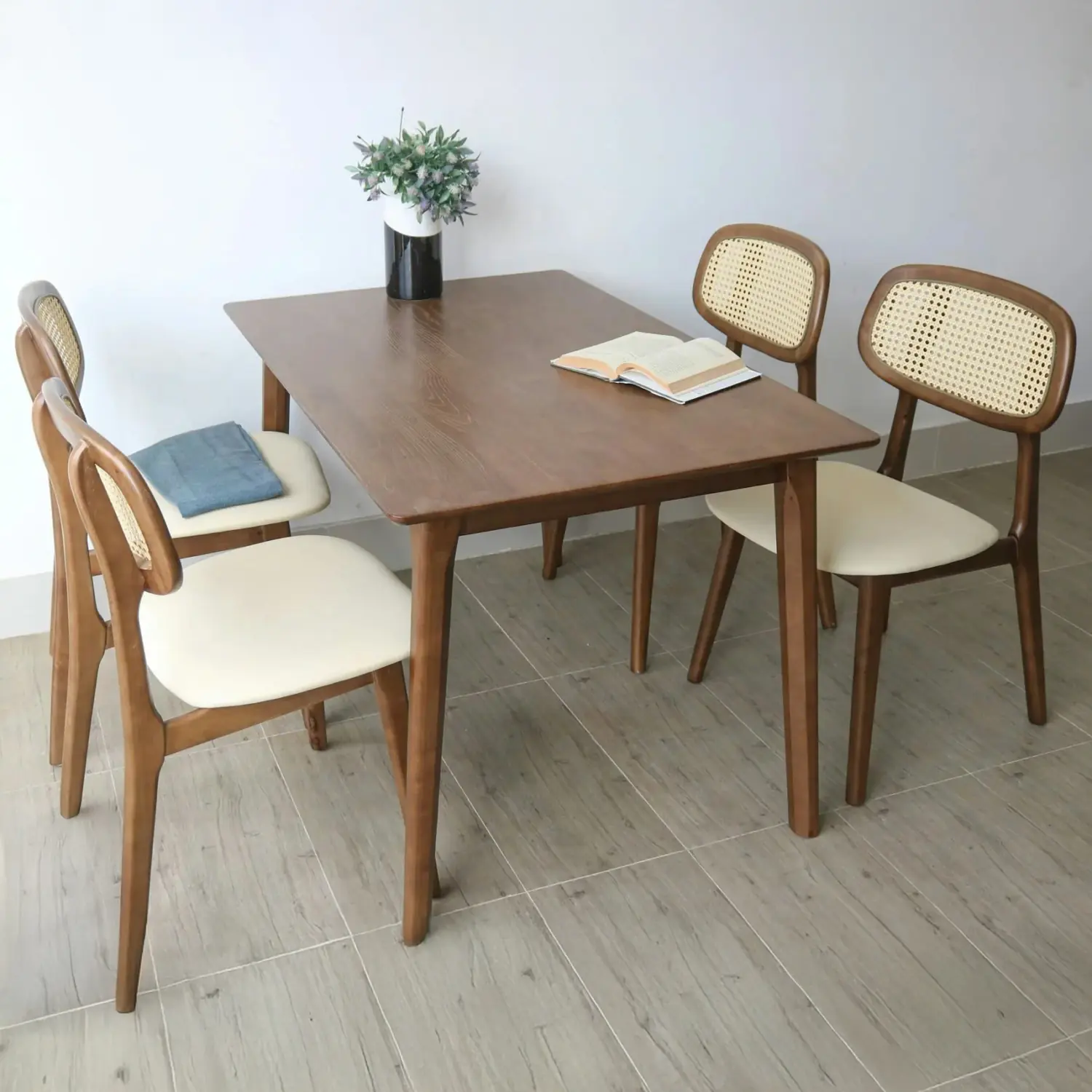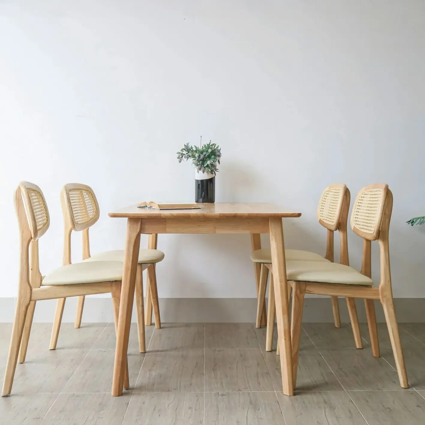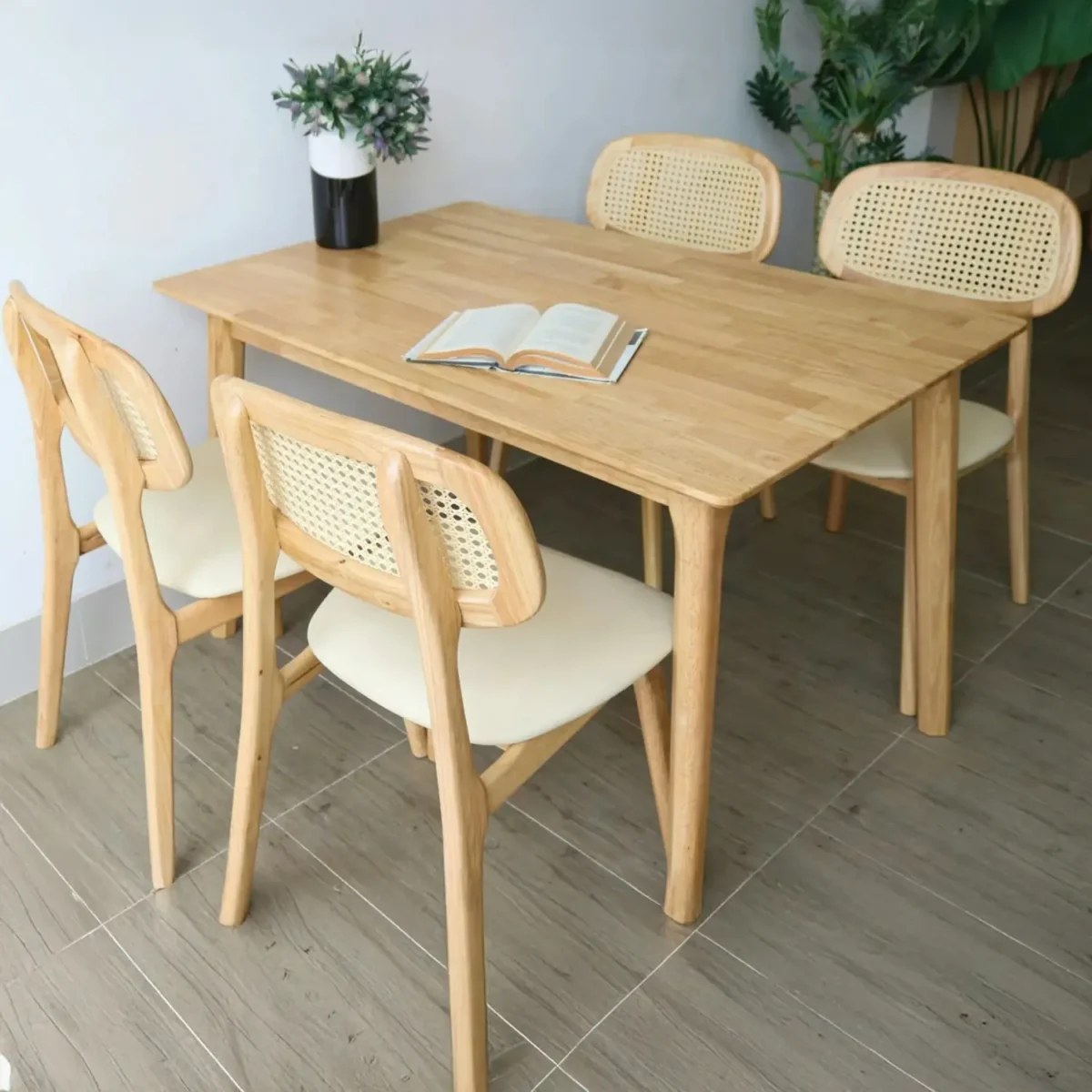Mẫu bàn ăn gỗ tự nhiên 4 ghế mang đến vẻ đẹp tinh tế và ấm cúng cho không gian phòng bếp. Thiết kế hiện đại, kết hợp giữa chất liệu gỗ cao su tự nhiên chắc chắn cùng ghế bọc da PU êm ái, tạo nên trải nghiệm thoải mái và sang trọng trong từng bữa ăn gia đình.