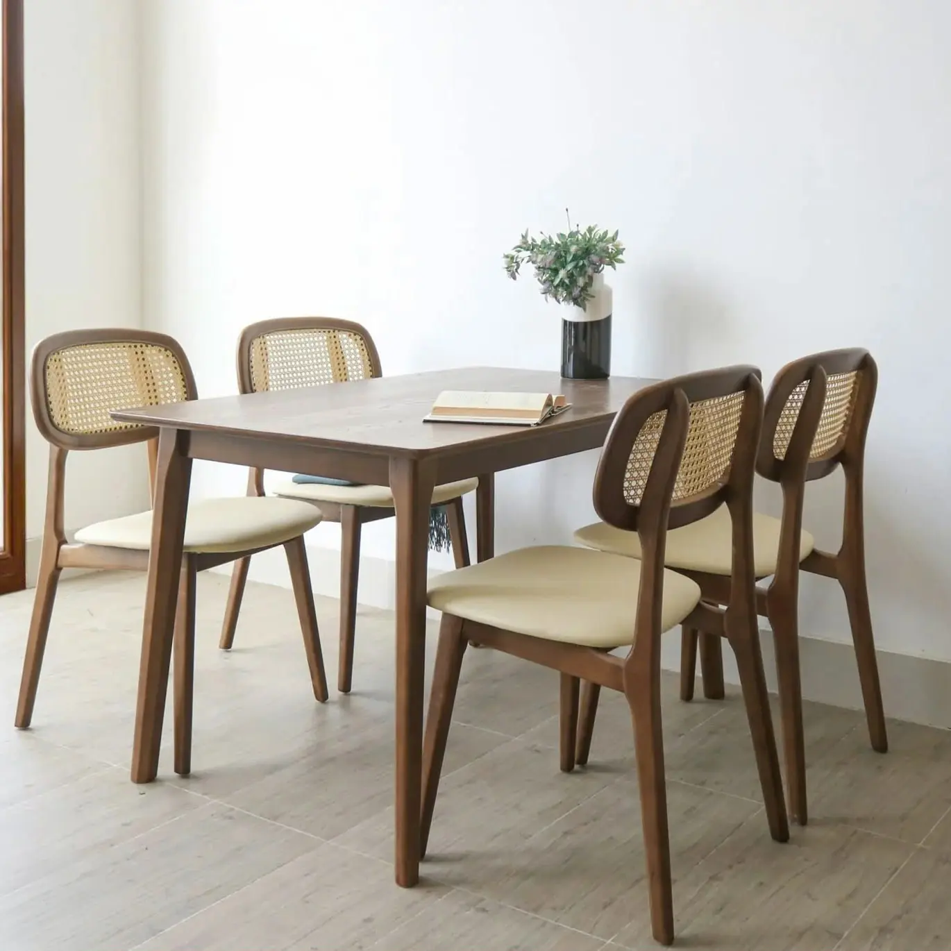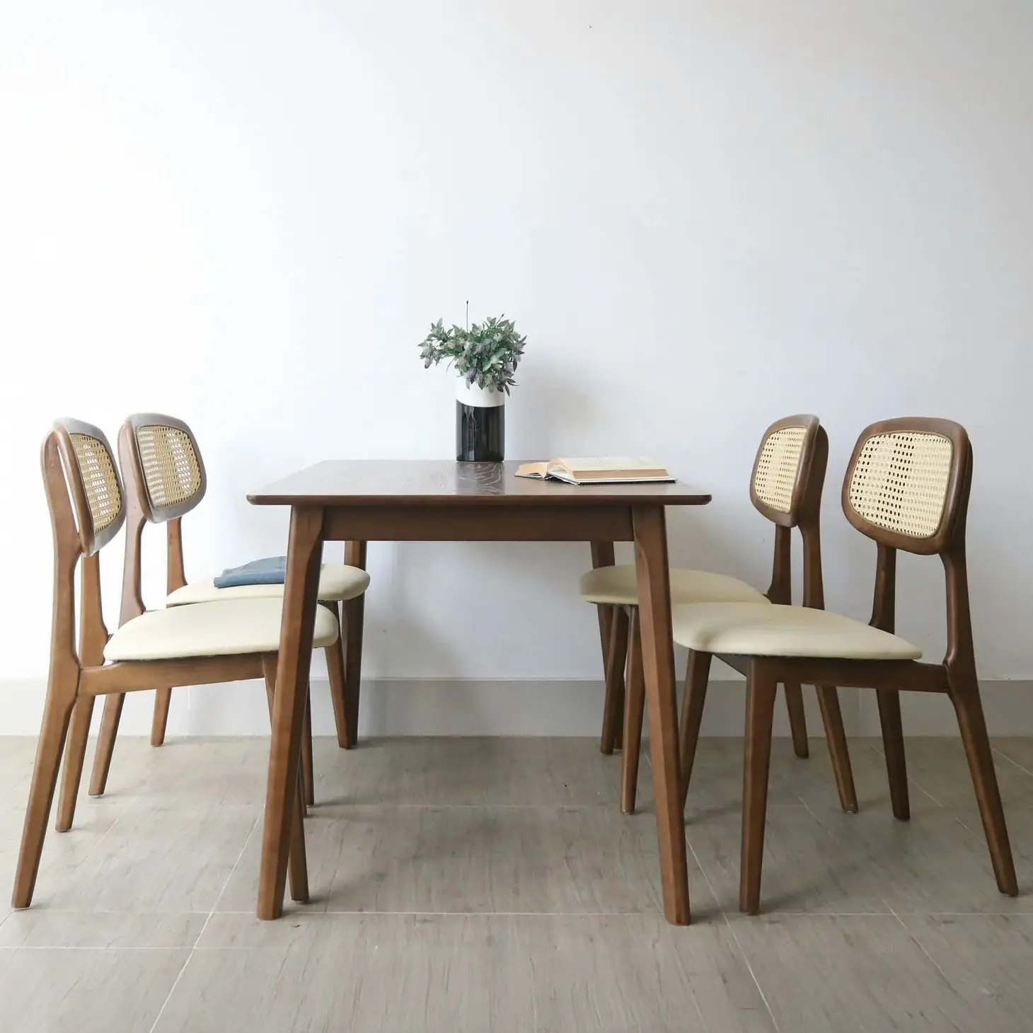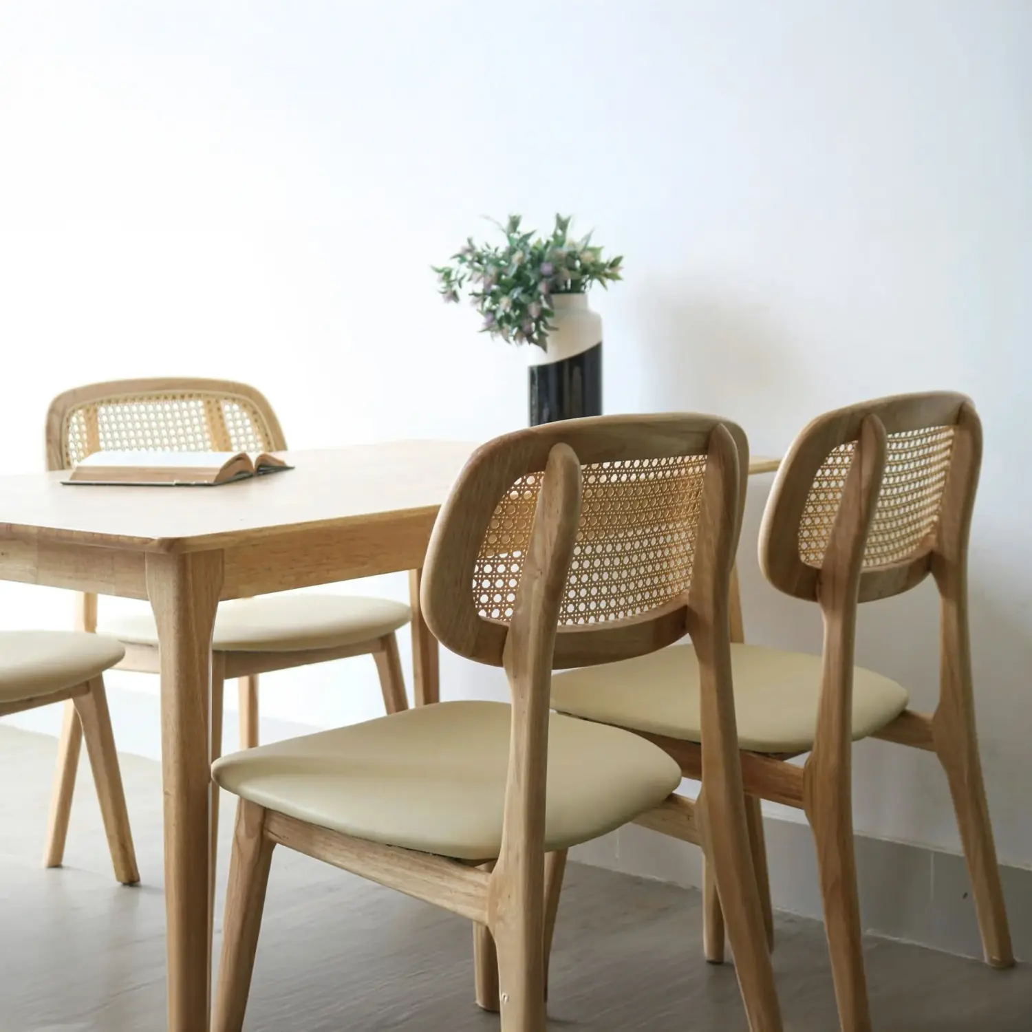 Mẫu bàn ăn gỗ tự nhiên 4 ghế mang đến vẻ đẹp tinh tế và ấm cúng cho không gian phòng bếp. Thiết kế hiện đại, kết hợp giữa chất liệu gỗ cao su tự nhiên chắc chắn cùng ghế bọc da PU êm ái, tạo nên trải nghiệm thoải mái và sang trọng trong từng bữa ăn gia đình.