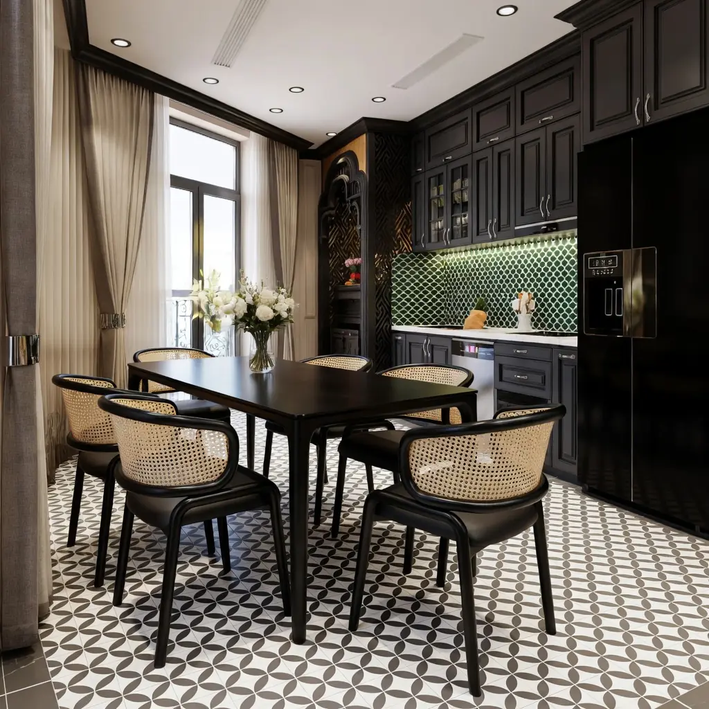 Bộ bàn ăn gỗ sơn đen cao cấp mang đến vẻ đẹp sang trọng và khác biệt cho khu vực phòng ăn nhờ sự giao thoa tinh tế giữa phong cách Bắc Âu (Scandinavian) và nét hoài cổ Indochine. Sản phẩm hiện được phân phối trực tiếp tại Tổng kho nội thất – Tongkhonoithatgiadinh.com, là món đồ nội thất gia đình hoàn hảo giúp khẳng định gu thẩm mỹ đẳng cấp của gia chủ.