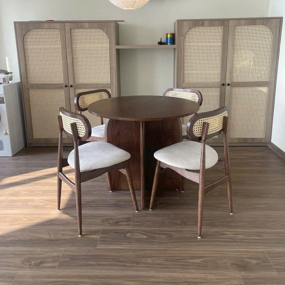 Bộ bàn ăn tròn 4 ghế gỗ tần bì hiện đại là lựa chọn lý tưởng cho không gian phòng ăn gia đình yêu thích sự tối giản nhưng vẫn đảm bảo nét sang trọng. Thiết kế bàn tròn kết hợp chân trụ vững chắc tạo điểm nhấn cân đối, giúp tổng thể không gian trở nên hài hòa và ấm cúng hơn.