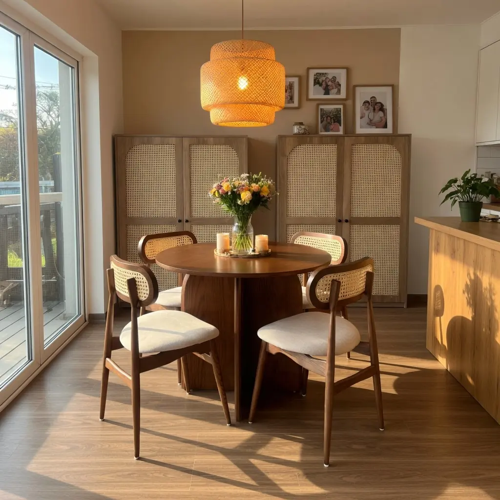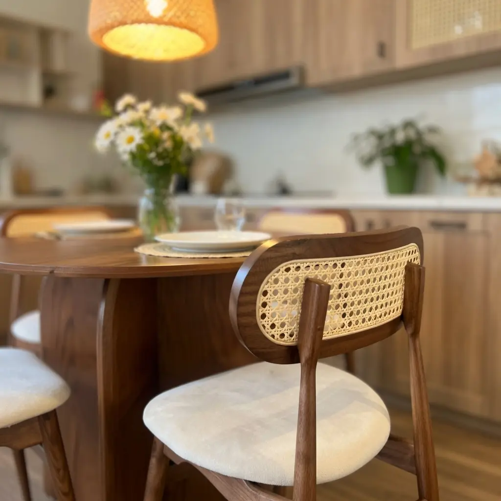 Sự kết hợp giữa gỗ tự nhiên và chi tiết mây đan mang đến phong cách vừa hiện đại vừa có chút hoài cổ tinh tế.