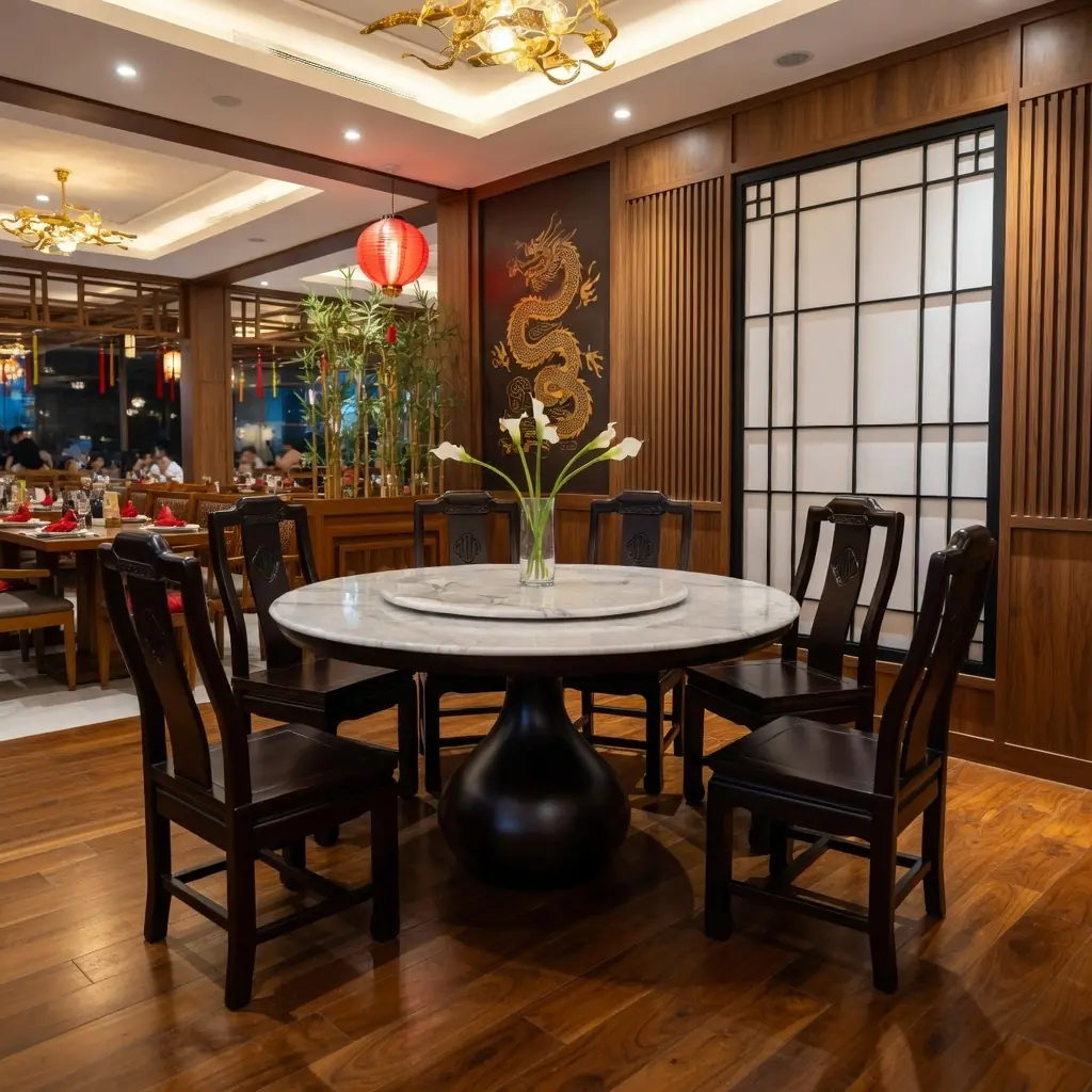 Kích thước bàn tròn rộng rãi: Bàn sở hữu đường kính 130cm, tích hợp mâm xoay 80cm tiện lợi cùng chiều cao chuẩn 77cm. Phần chân trụ của bàn được thiết kế dạng khối lớn vững chắc hình hồ lô, mang lại sự bề thế tuyệt đối.