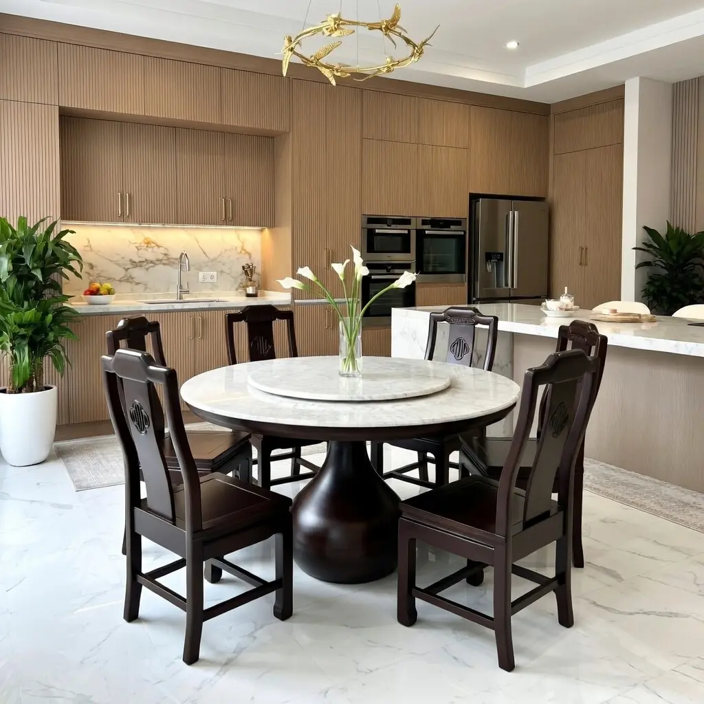 Bộ Bàn Ăn Tròn Gỗ Gụ Nam Phi Mặt Đá Thạch Anh – Dấu Ấn Cổ Điển Sang Trọng